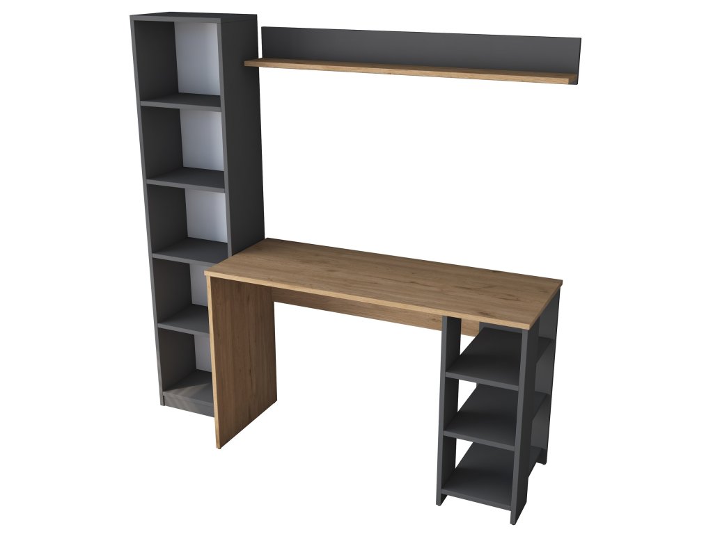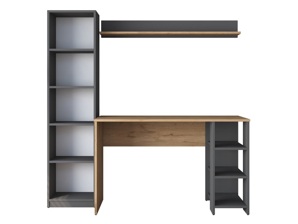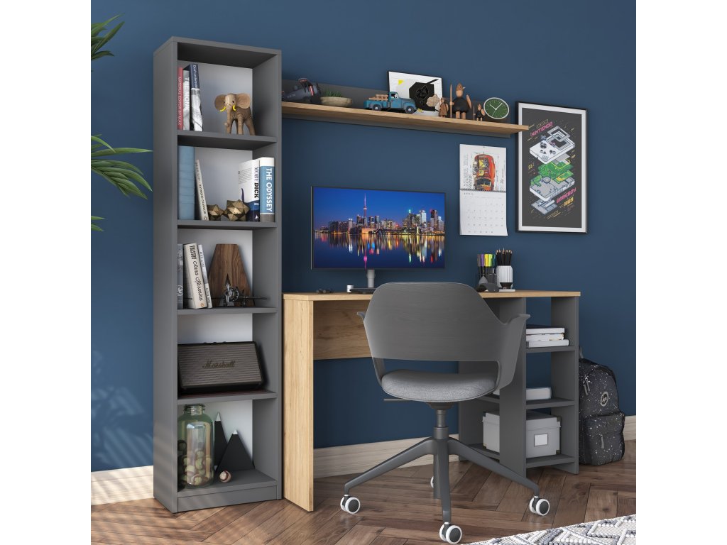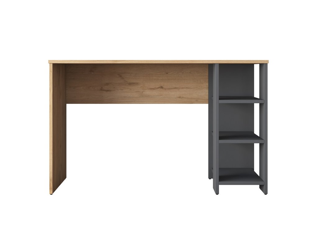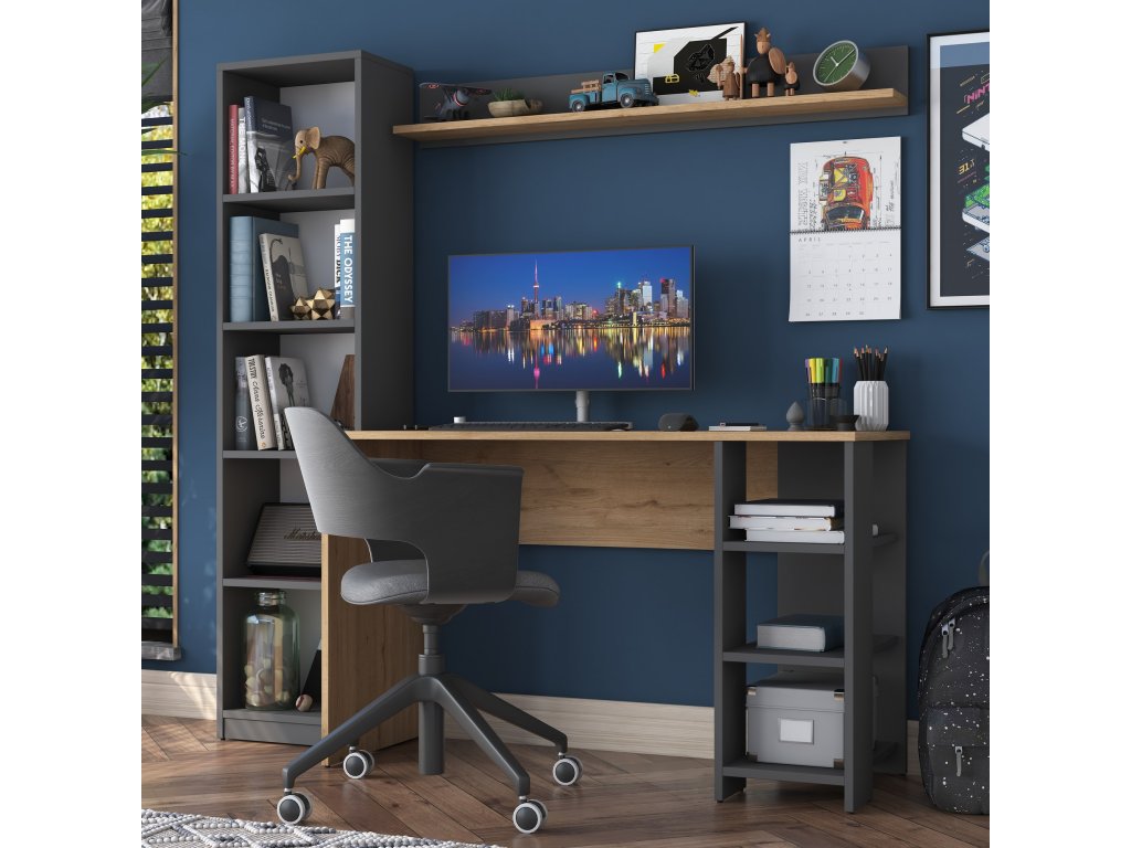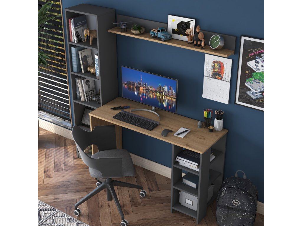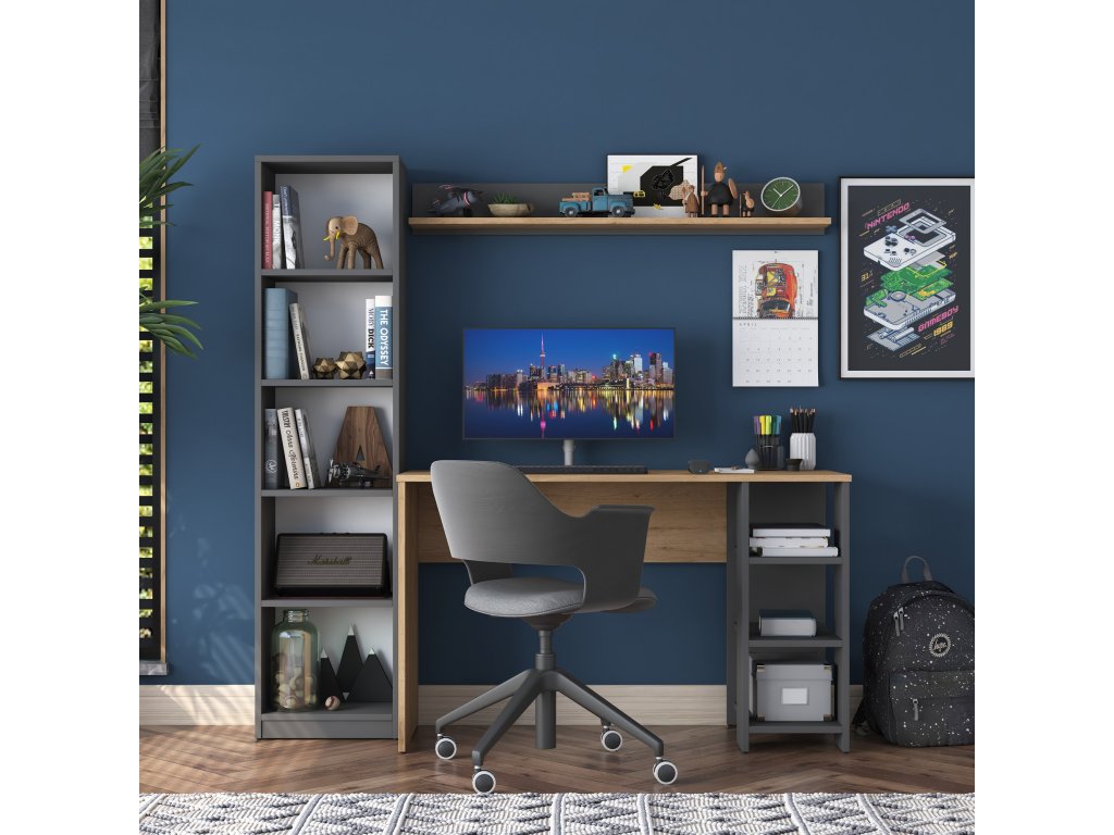 Psací stůl s regálem HARE je ideálním spojením stylu a funkčnosti. Kombinace dekoru ořechu a antracitu přináší moderní vzhled, zatímco chytré uspořádání s regálkem a odkládacími policemi nabízí dostatek prostoru pro organizaci vašich věcí. Perfektní volba pro dětský pokoj, kancelář nebo pracovnu.