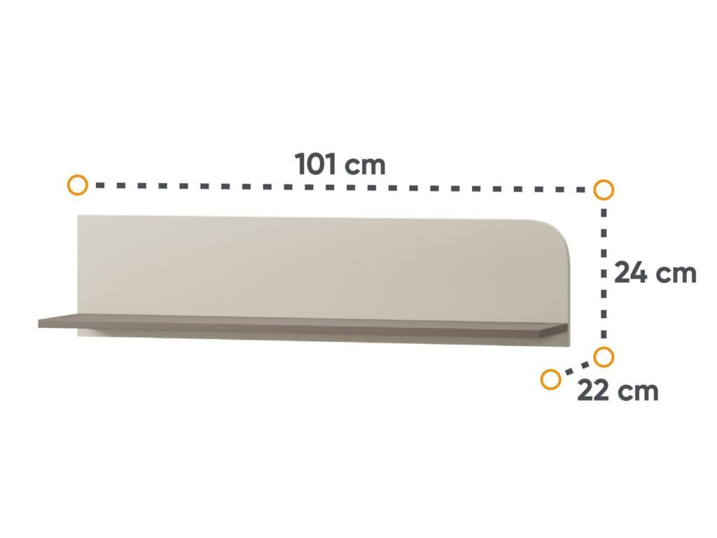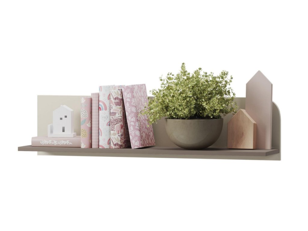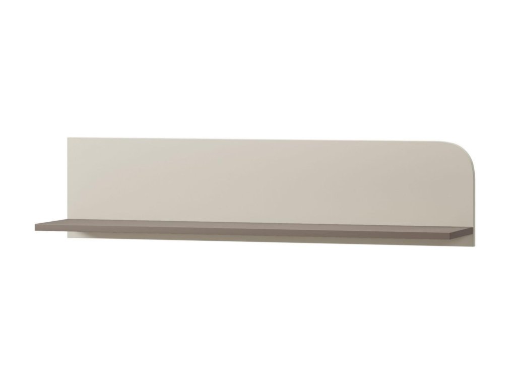 Závěsná police. Nábytek pro teenagery, který díky něžnosti hlavně ocení divky, nabízí moderní a praktické řešení do pokojů. Kombinace kašmírové a lanýžové barvy vytváří elegantní a univerzální design. Vyniká zaoblenými čely, asymetrickým stylem, které dodávají lehký vzhled. Vyroben je z odolné laminované desky o tloušťce 16 mm. Ideální volba pro stylový a funkční prostor. Dodáváme v demontovaném stavu.