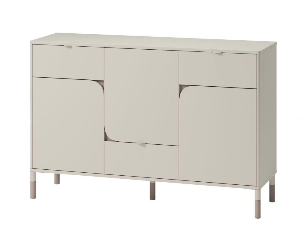 Komoda třídveřová se třemi zásuvkami. Nábytek pro teenagery, který díky něžnosti hlavně ocení divky, nabízí moderní a praktické řešení do pokojů. Kombinace kašmírové a lanýžové barvy vytváří elegantní a univerzální design. Vyniká zaoblenými čely, asymetrickým stylem a štíhlými nožkami, které dodávají lehký vzhled. Vyroben je z odolné laminované desky o tloušťce 16 mm, zadní stěna je z HDF desky o tloušťce 3 mm. Jemné úchyty jsou kuličkové vyrobené z plastu. Ideální volba pro stylový a funkční prostor. Dodáváme v demontovaném stavu.