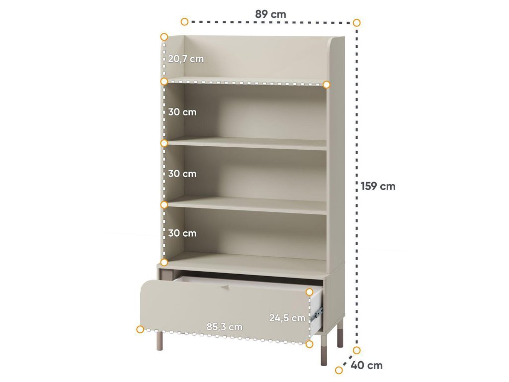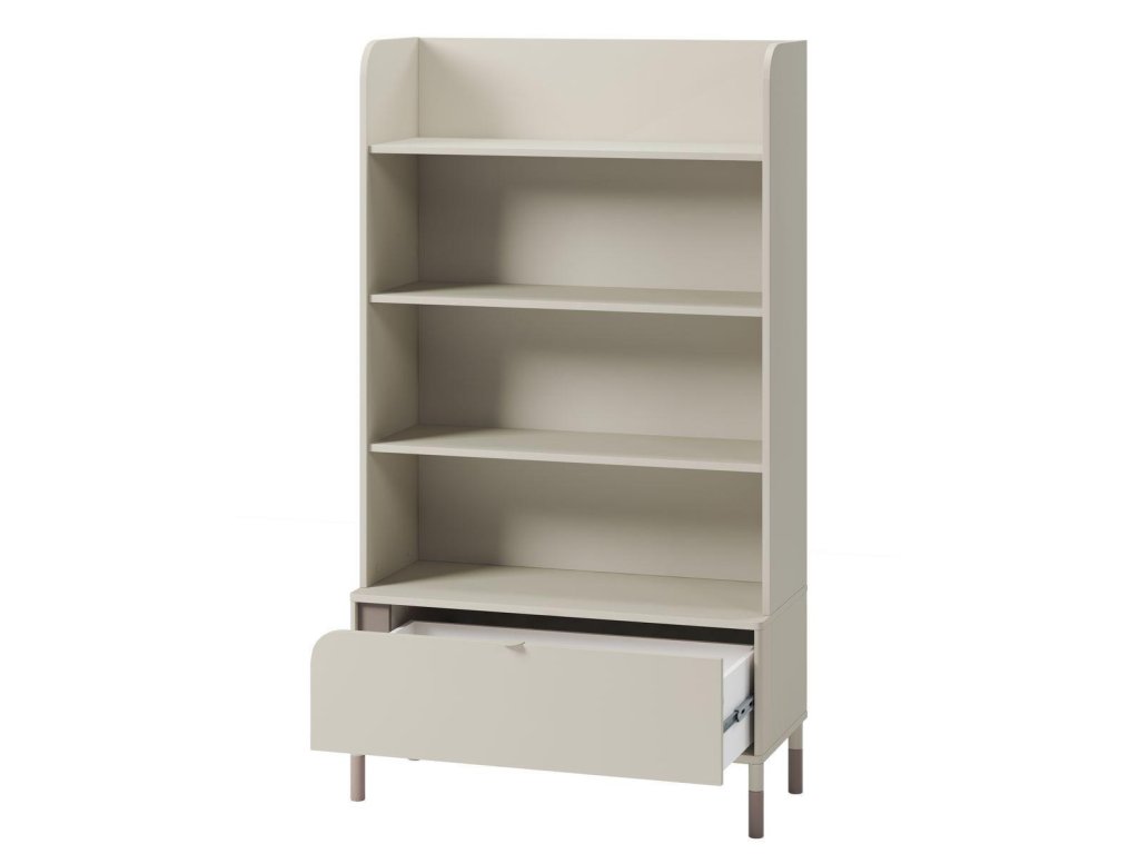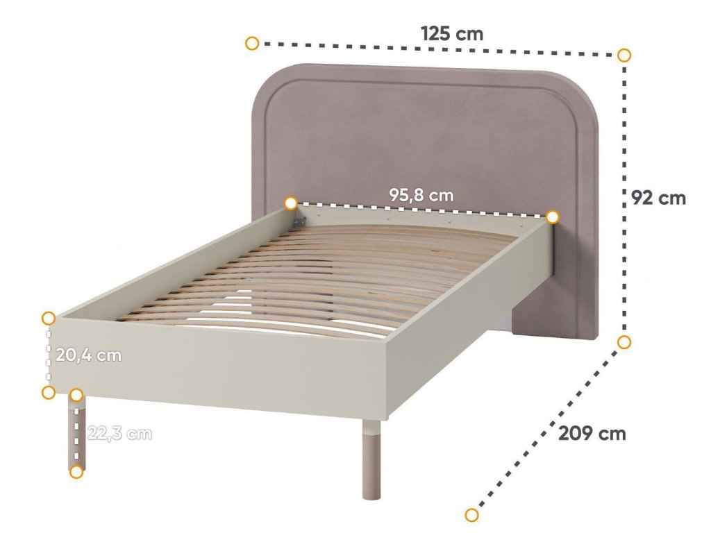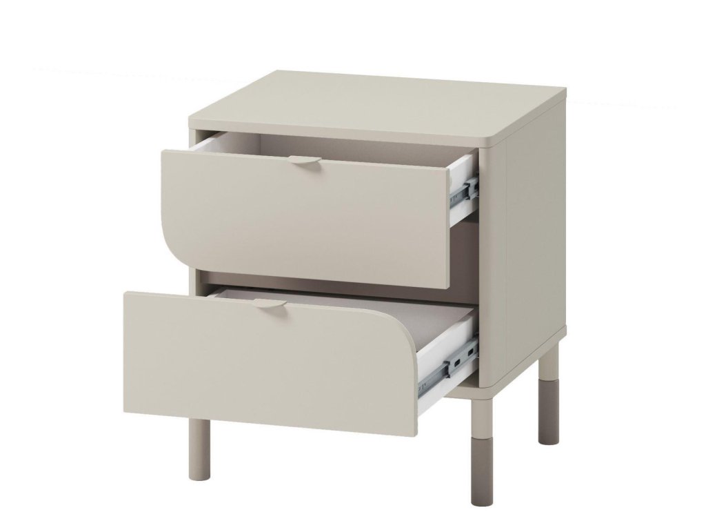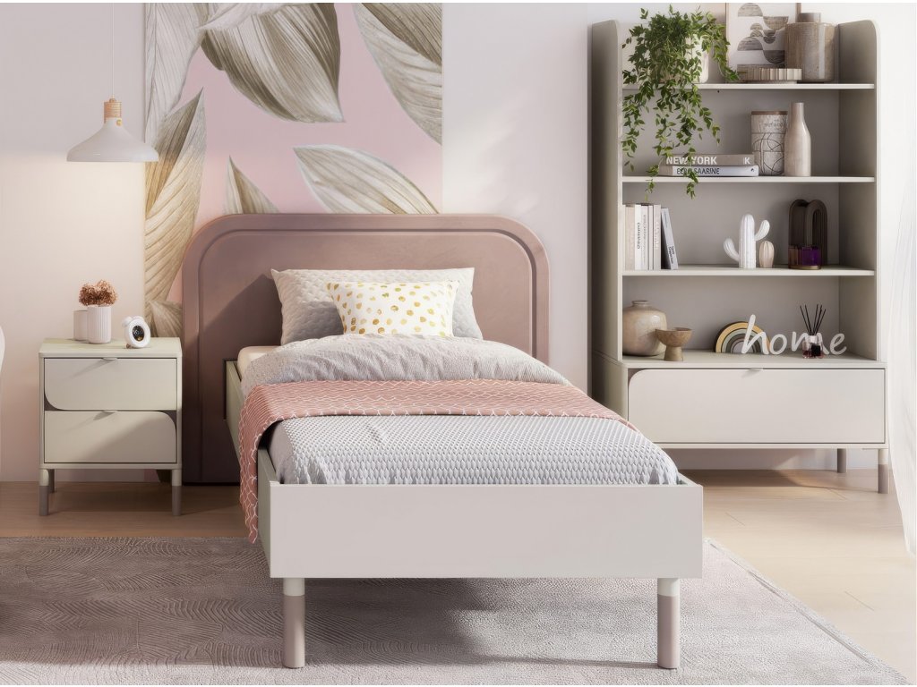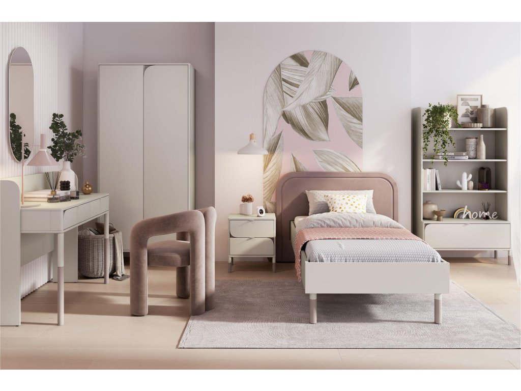 Ložnicová sestava. Postel s laťovým roštem v ceně a krásným čelem, praktický noční stolek se 2 zásuvkami a regál se spodní zásuvkou. Nábytek pro teenagery, který díky něžnosti hlavně ocení divky, nabízí moderní a praktické řešení do pokojů. Kombinace kašmírové a lanýžové barvy vytváří elegantní a univerzální design. Vyniká zaoblenými čely, asymetrickým stylem a štíhlými nožkami, které dodávají lehký vzhled. Vyroben je z odolné laminované desky o tloušťce 16 mm. Ideální volba pro stylový a funkční prostor. Vhodná matrace je 90 x 200 cm. Rozměry viz obrázky. Jednotlivé díly lze zakoupit zvlášť či dokoupit další nábytek tohoto sektoru. Dodáváme v demontovaném stavu.