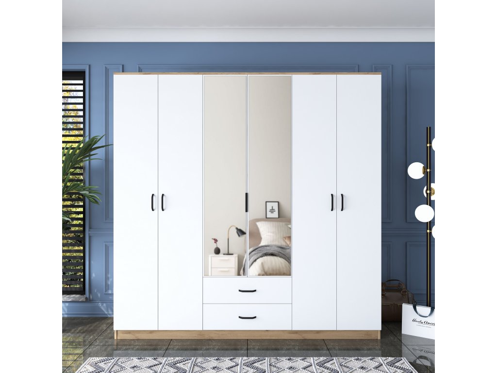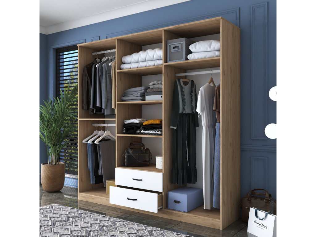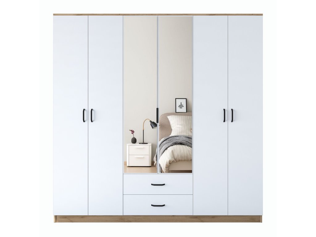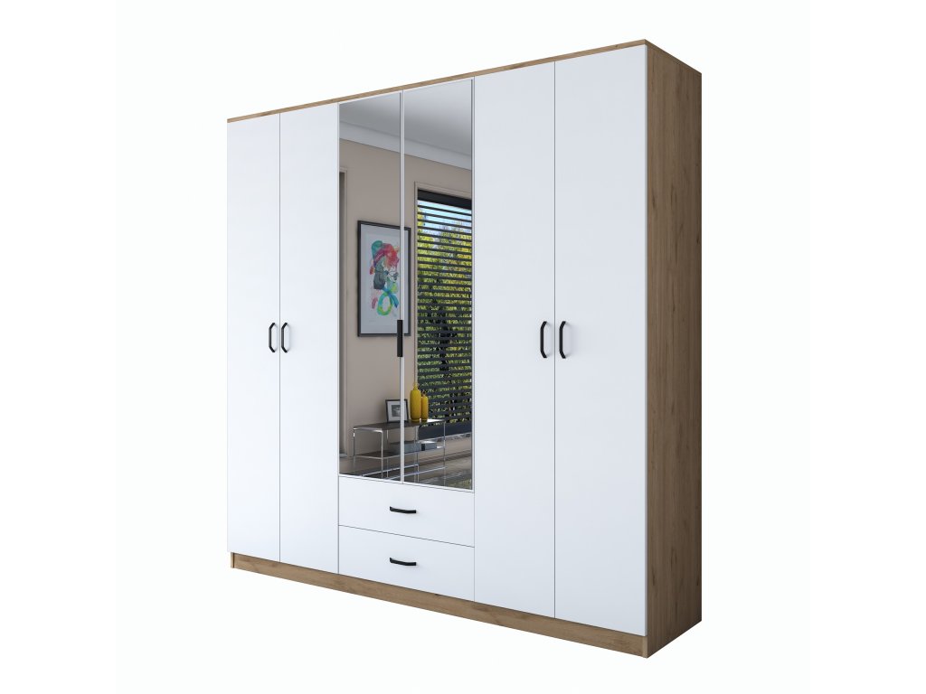 Šatní skříň HAWKEYE kombinuje moderní design s praktickým uspořádáním. Díky širokému a vysokému provedení nabízí dostatek úložného prostoru, zatímco elegantní kombinace bílé barvy a ořechového dekoru přináší styl a harmonii do každé ložnice.