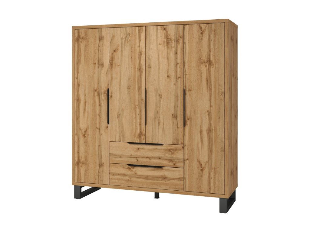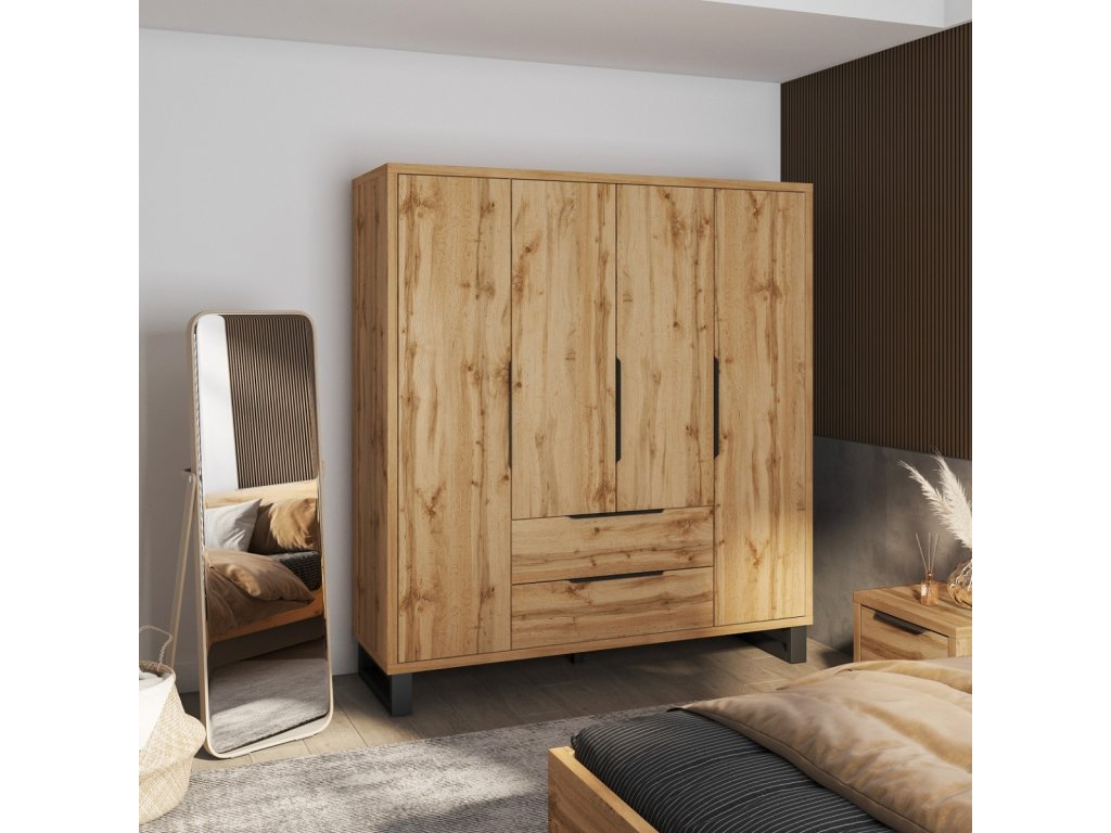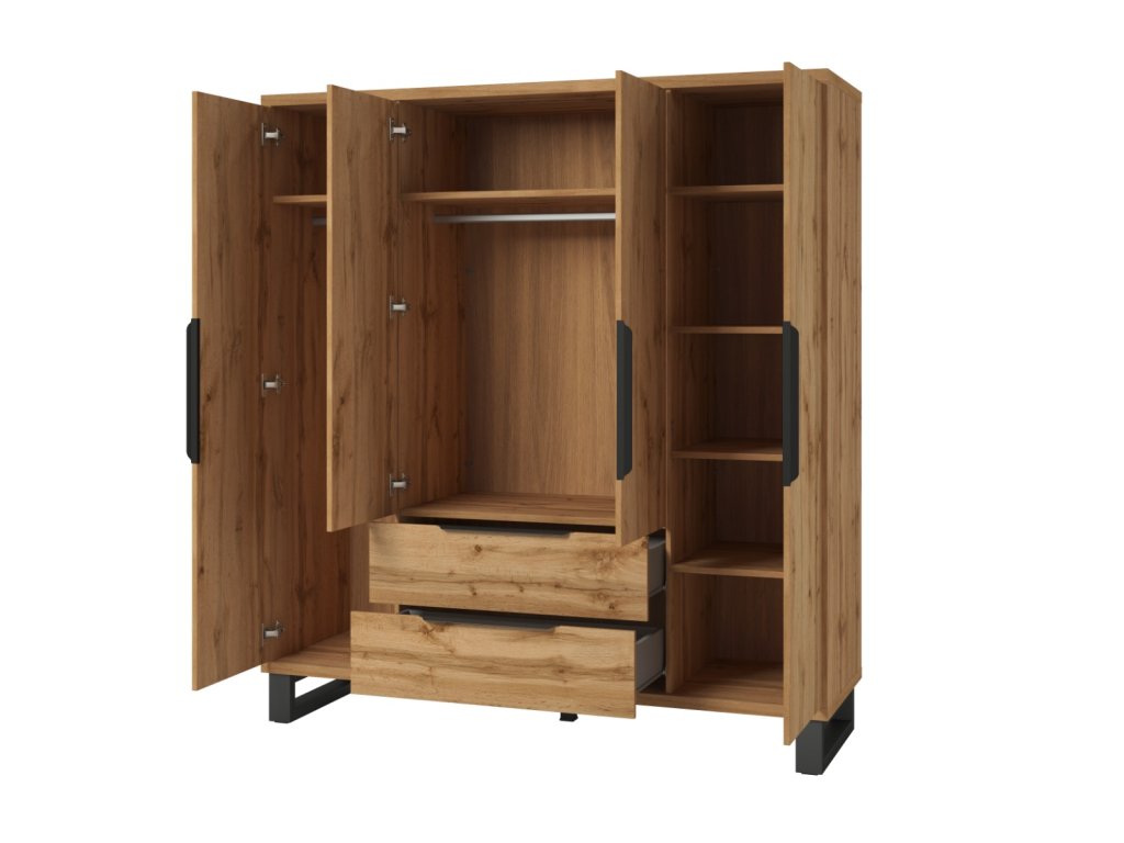 Šatní skříň je čtyřdveřová. Uvnitř skříně jsou police a jedna šatní tyč. Disponuje dvěma praktickými zásuvkami.