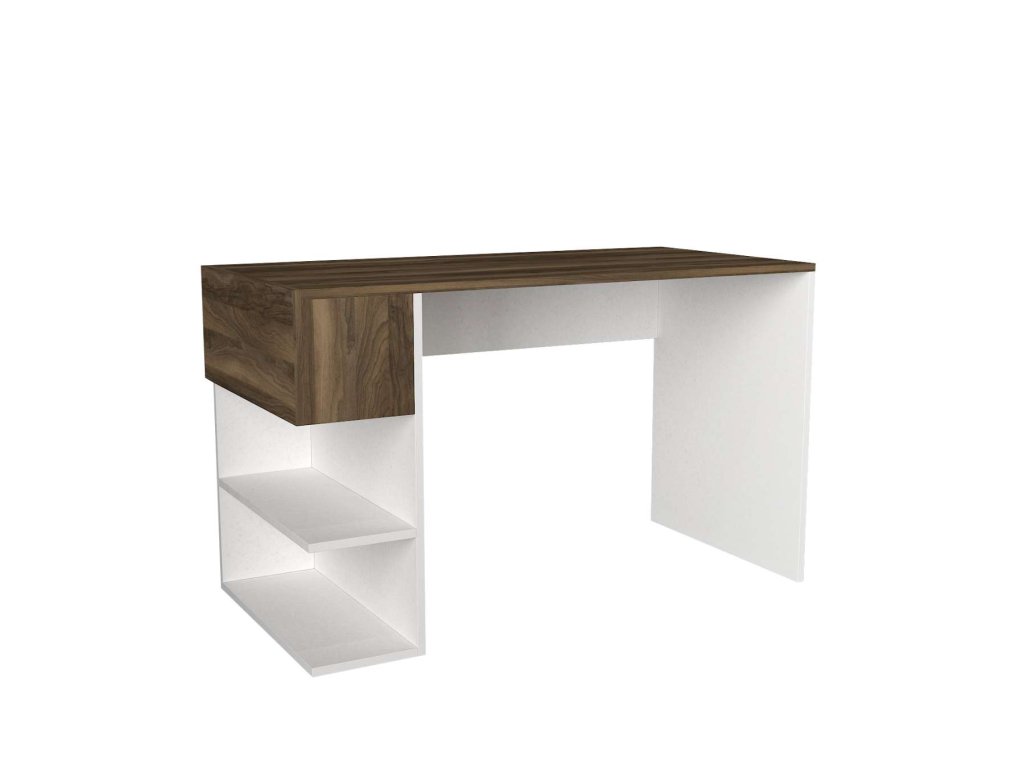 Stůl HONZO je vyroben z kvalitního LTD materiálu s tloušťkou 18 mm, což zajišťuje jeho pevnost a dlouhou životnost. Elegantní kombinace bílé a ořechové barvy dodává stolu moderní a stylový vzhled, který se hodí do jakéhokoliv interiéru. Stůl je vybaven praktickým regálkem, který poskytuje dostatek úložného prostoru pro vaše pracovní potřeby a pomůcky.