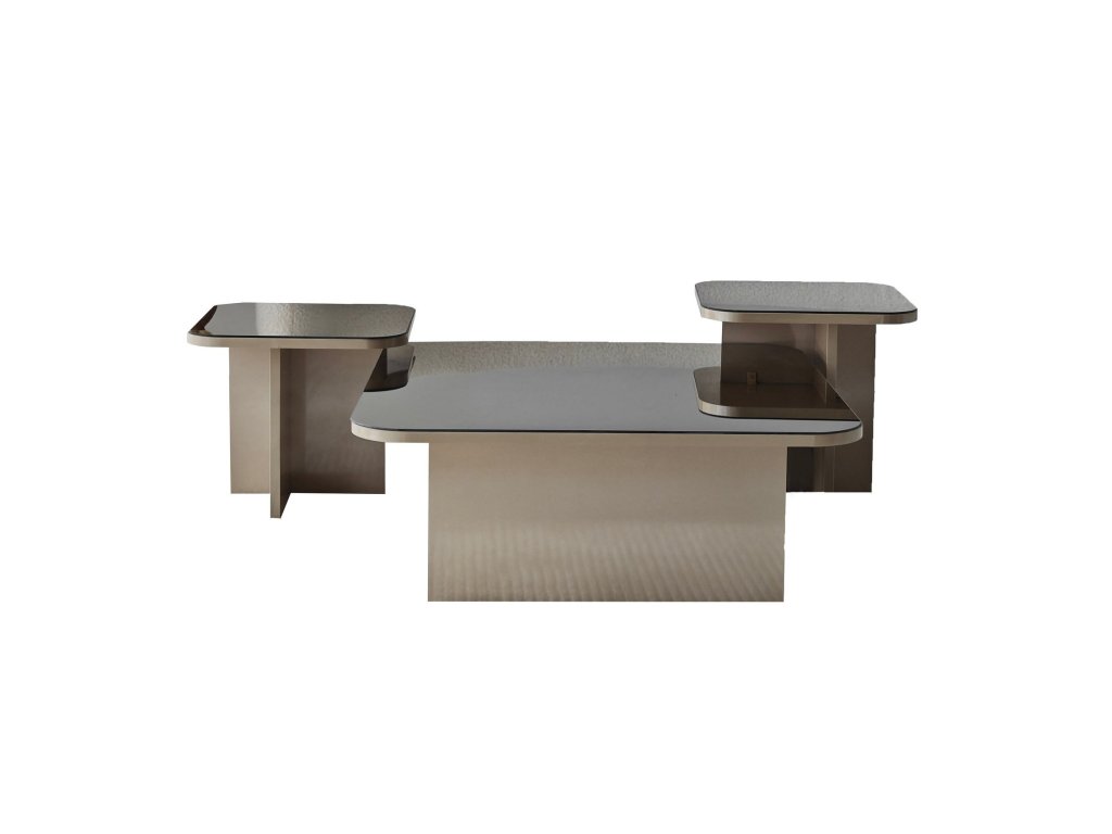 Set konferenčních stolků HUG nabízí elegantní řešení pro váš obývací pokoj. Díky kombinaci béžové a bronzové barvy a modernímu designu vynikne v každém interiéru a zároveň poskytne vysokou funkčnost.