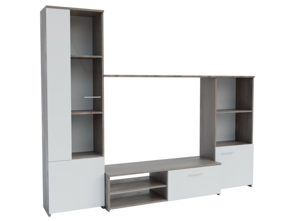 Obývací stěna HUGO zaujme elegancí a velmi příznivou cenou. Klasická bílá barva se lehce kombinuje a hodí se do každého interiéru. Díky svým praktickým rozměrům se vejde i do menších pístorů. Korpus je šedé barvy.