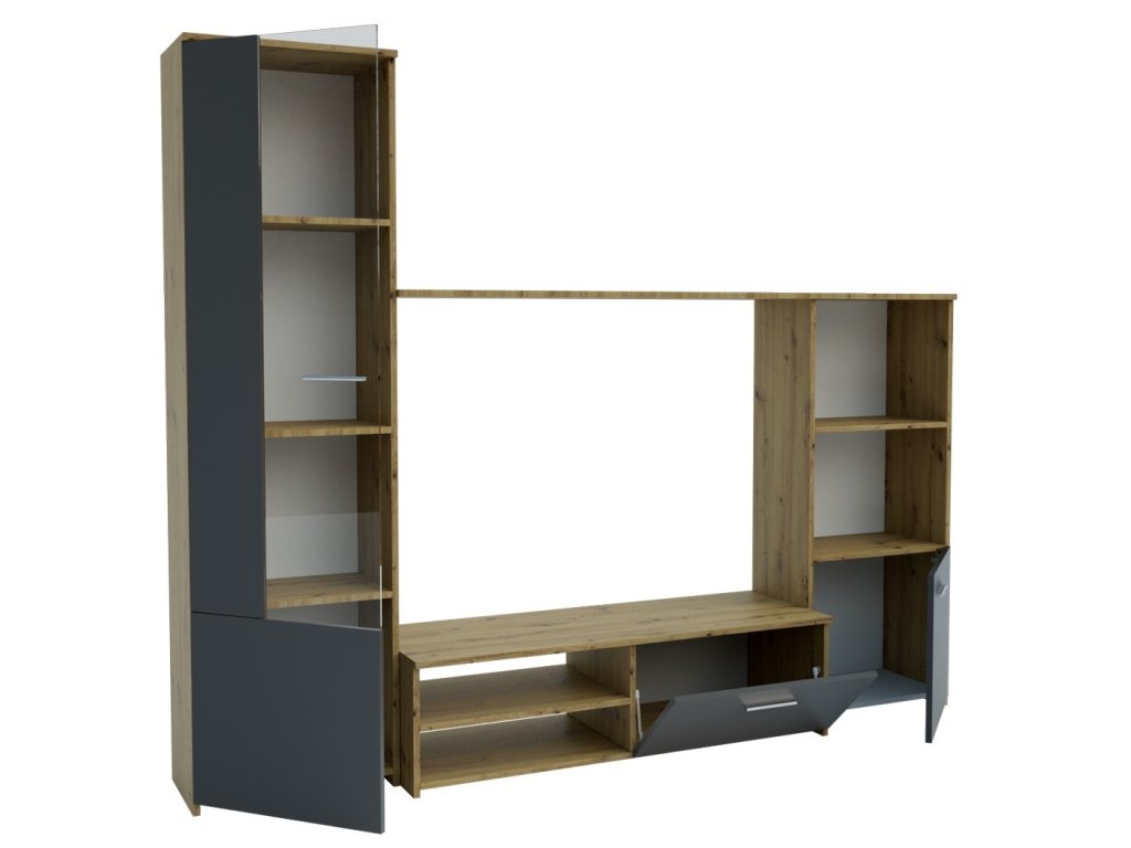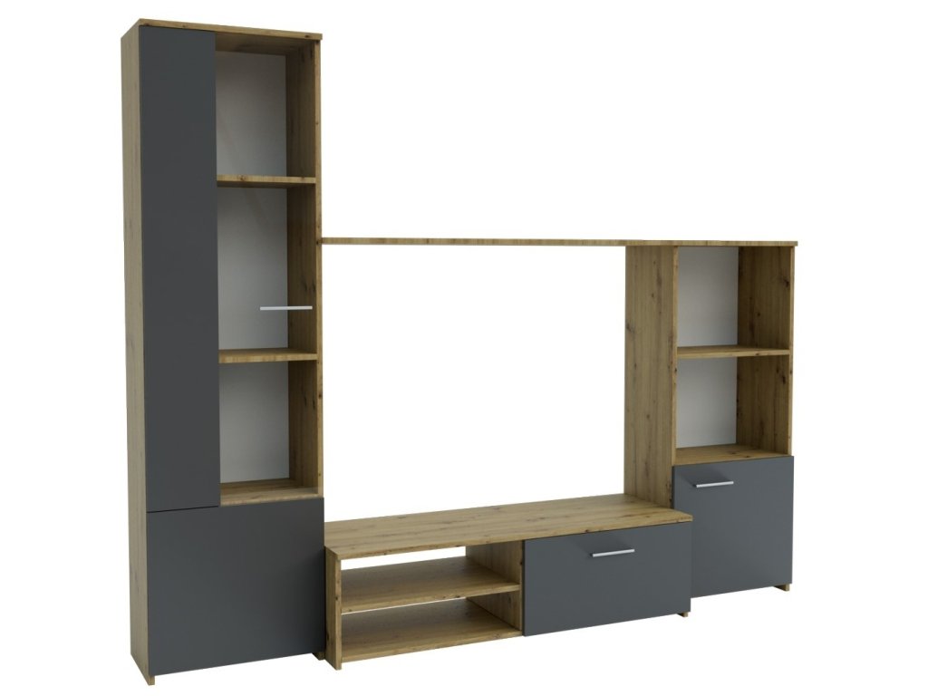 Obývací stěna HUGO zaujme elegancí a velmi příznivou cenou. Barva šedý grafit se lehce kombinuje a hodí se do každého interiéru. Díky svým praktickým rozměrům se vejde i do menších pístorů. Korpus je doplněn šedým kraft dubem.