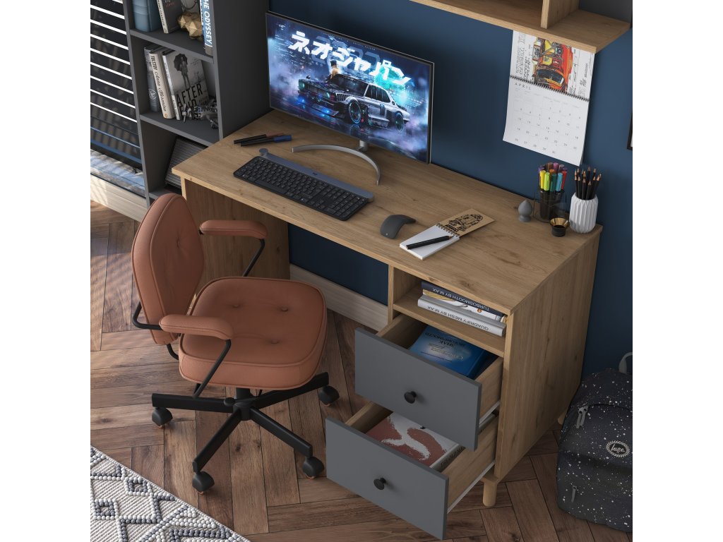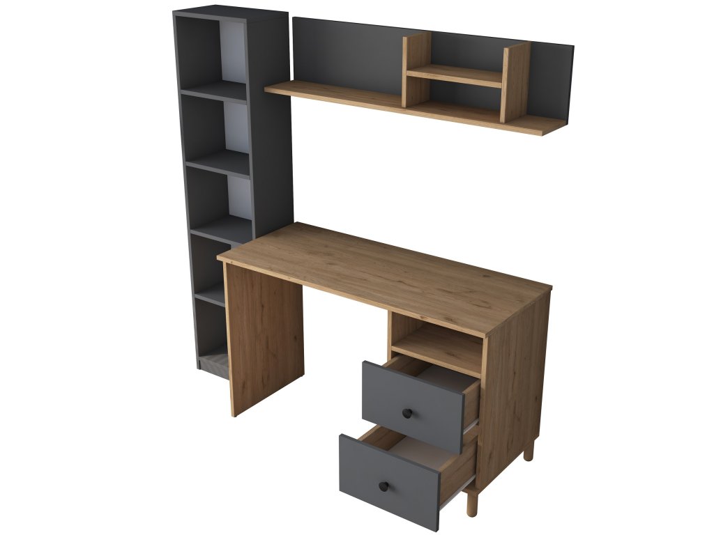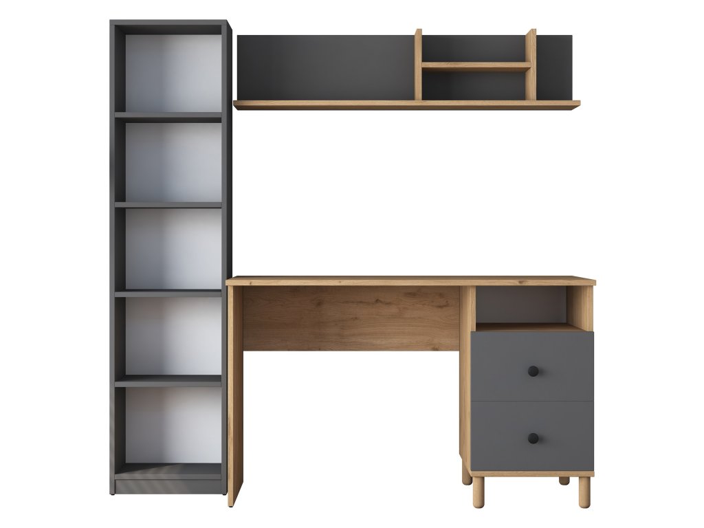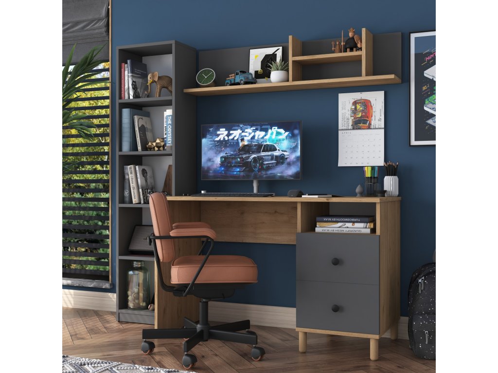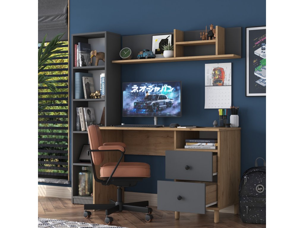HUNGARY je moderní a praktický písací stůl s regálem, který je ideální pro dětský pokoj nebo kancelář či pracovnu. Tento stylový kus nábytku v kombinaci ořechového dekoru a antracitové barvy nabízí funkčnost i elegantní design pro vaše každodenní potřeby.