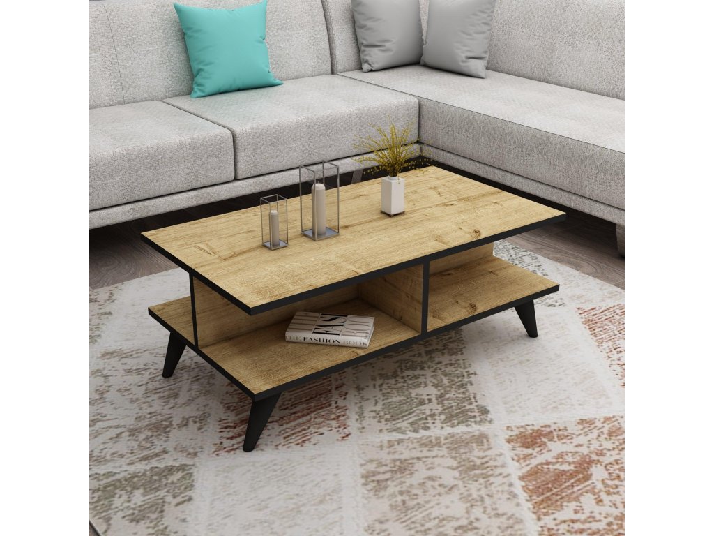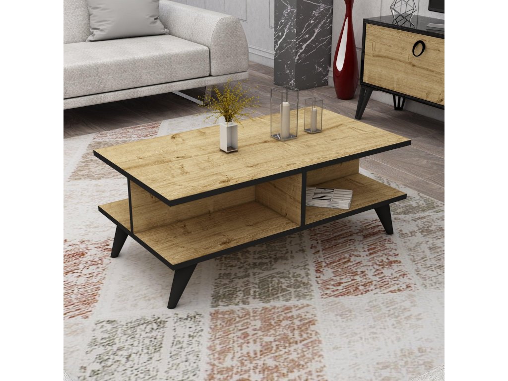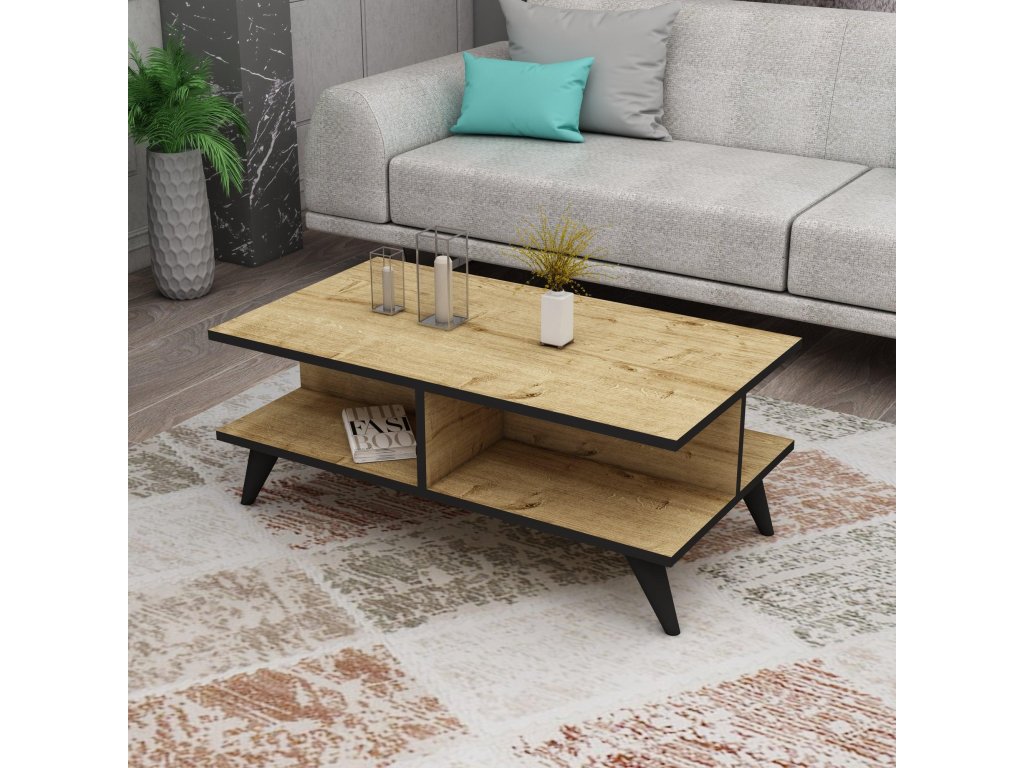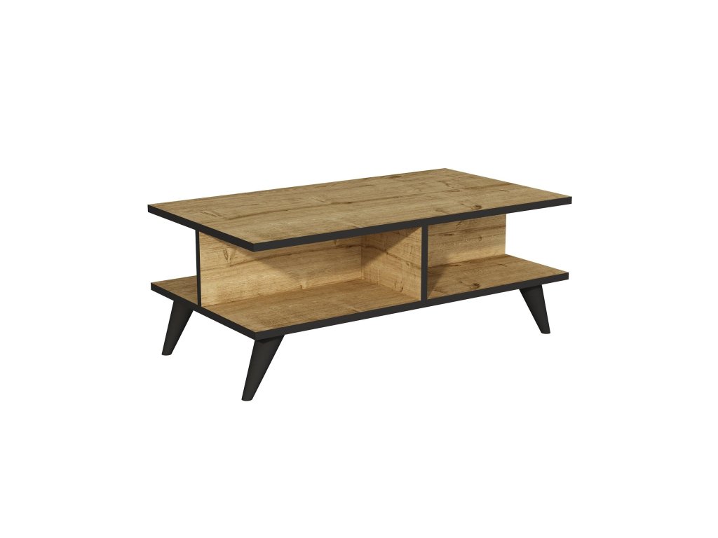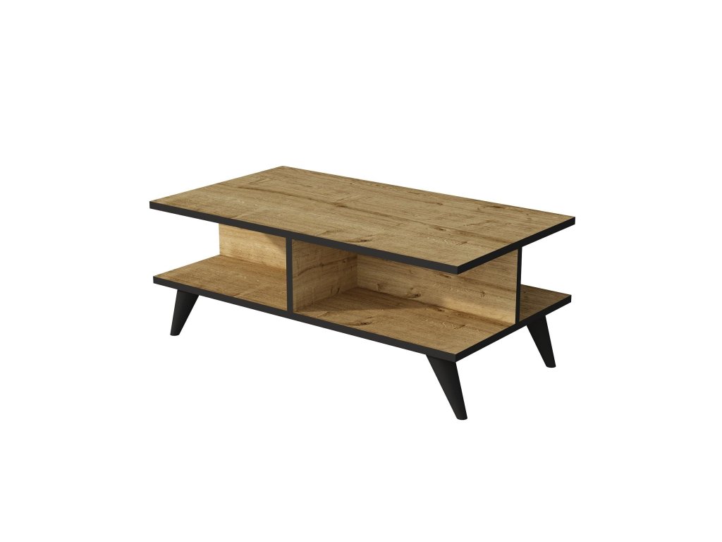 Konferenční stolek IDAHO kombinuje funkčnost a moderní design, který dokonale zapadne do každého obývacího pokoje. Díky svému nízkému vzhledu a praktické odkládací polici nabízí ideální prostor pro odložení časopisů, ovladačů nebo jiných předmětů. Stylová kombinace dubu a černé barvy podtrhne estetiku vašeho interiéru.