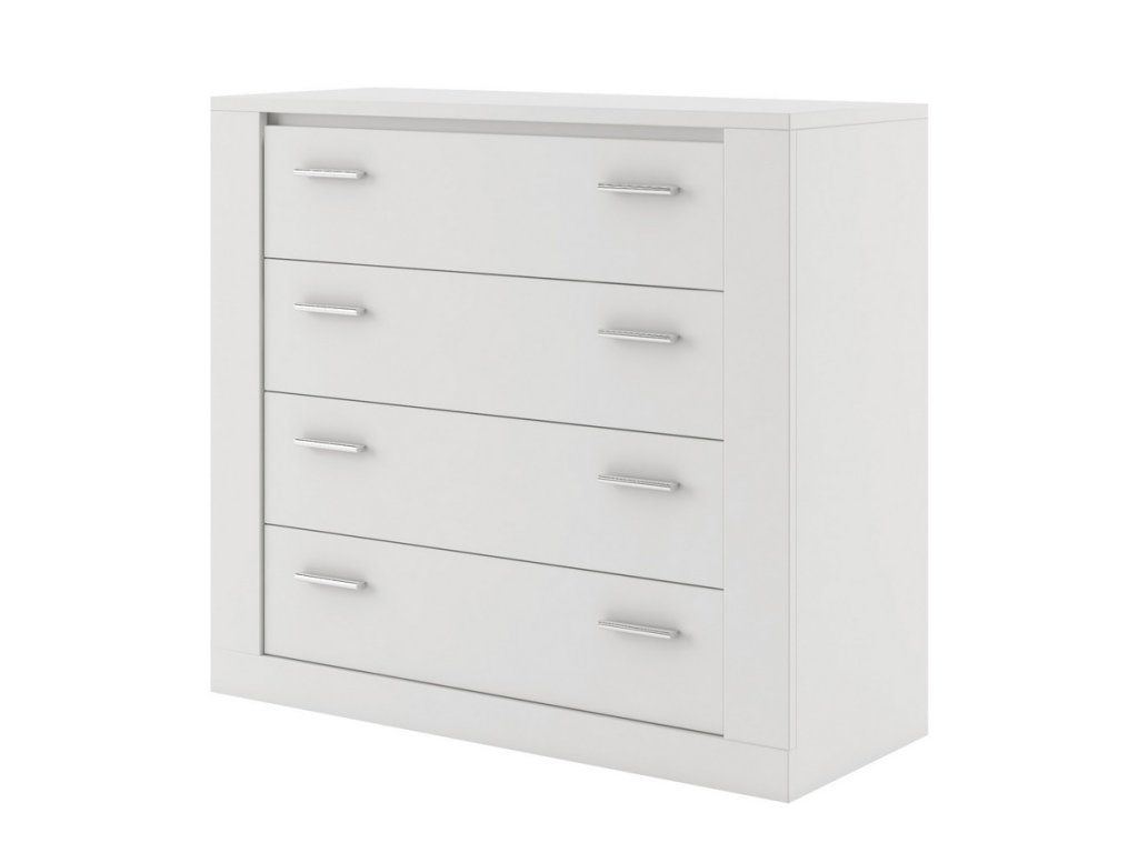 Moderní komoda. Komoda má čtyři zásuvky. Korpus a dvířka jsou z kvalitního LTD v bílé matné barvě. Hrany u skříně jsou ohraničeny ABS páskou. Dodáváme v demontovaném stavu.