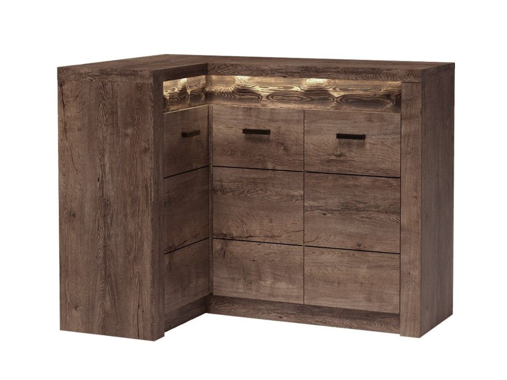 Rohová komoda s rohem nalevo. Roh nalevo znamená na levé straně jsou 1 dvířka, na pravé 2 dvířka. Možnost objednání i opačné verze. Rozměry viz perokresba. Systém je exkluzivní kolekce navržena v moderním duchu. Vsazením LED osvětlení do ozdobné rýhované lišty, které najdete v naší další nabídce k dokoupení, je zvýrazněn rustikální vzhled masivního dřeva. Celá řada se vyznačuje elegancí a jednoduchými tvary, které zaručují plné využití prostoru. Nábytek je vyroben z kvalitního lamina s ABS hrany ( 0,5-0,8 mm ). Barevné provedení jasan tmavý. Dodáváme v demontovaném stavu.Doplňkové parametry