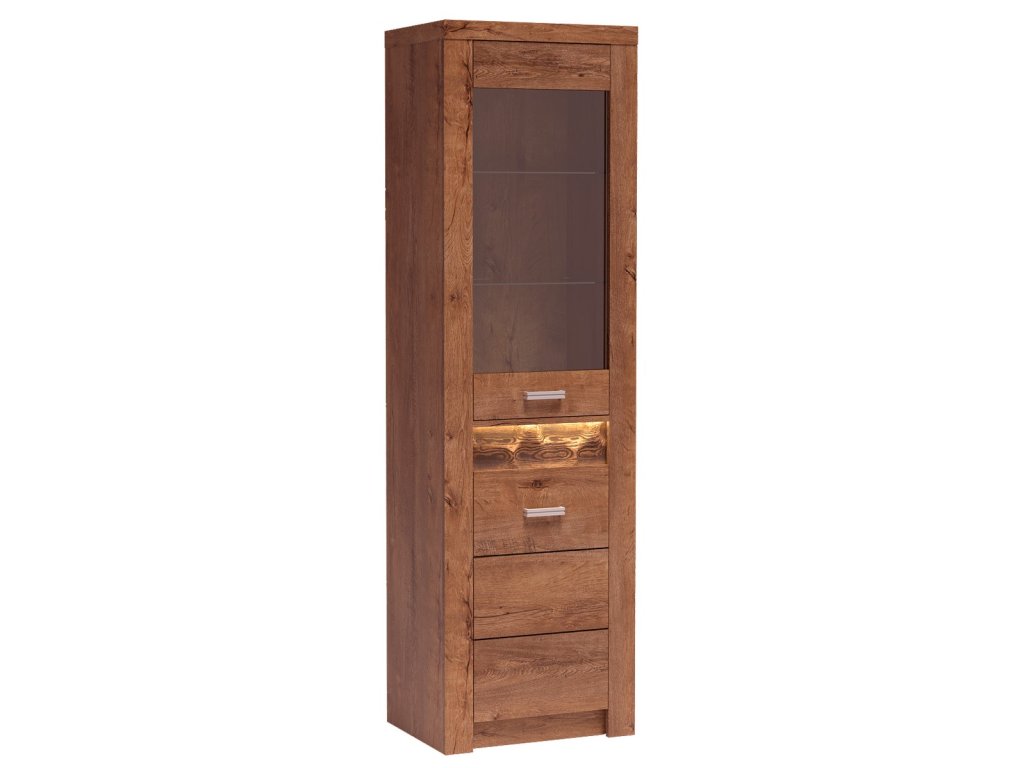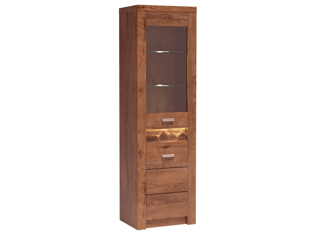 Vitrína ze sektorové řady. Za dvířky je 1 police. Systém je exkluzivní kolekce navržena v moderním duchu. Vsazením LED osvětlení do ozdobné rýhované lišty, které najdete v naší další nabídce k dokoupení, je zvýrazněn rustikální vzhled masivního dřeva. Možnost dokoupení LED bodového osvětlení i u skleněných polic. Celá řada se vyznačuje elegancí a jednoduchými tvary, které zaručují plné využití prostoru. Nábytek je vyroben z kvalitního lamina s ABS hrany ( 0,5-0,8 mm ). Barevné provedení jasan světlý. Dodáváme v demontovaném stavu.Doplňkové parametry