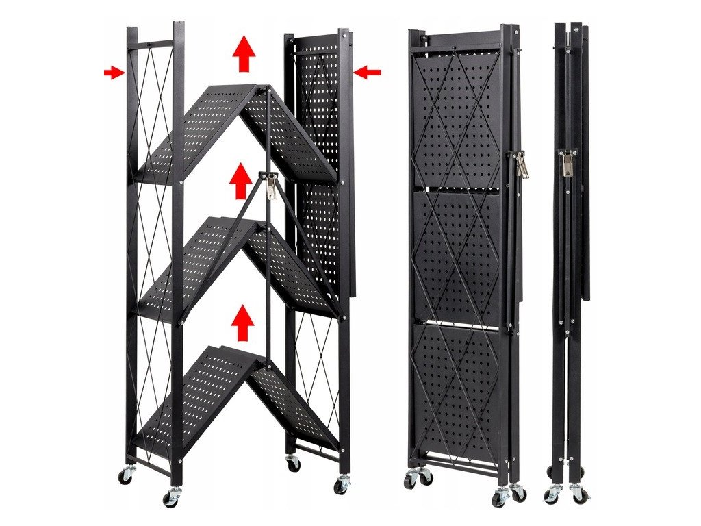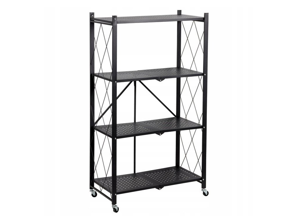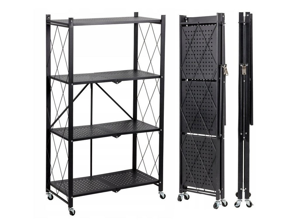 Dodatečné informace: Tento regál je skládací, což usnadňuje jeho přemístění a skladování. Mřížky na bocích přidávají estetický prvek a zároveň pomáhají udržet předměty na místě.