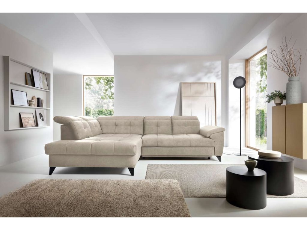 Rohová rozkládací sedačka IRENE – Váš nový středobod pohodlí a designu. Personalizujte svůj prostor výběrem béžové barvy a vytvořte si dokonalý prostor pro relaxaci a společenské setkání.