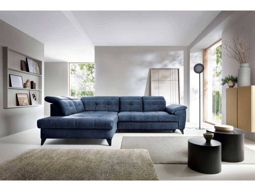 Rohová rozkládací sedačka IRENE – Váš nový středobod pohodlí a designu. Personalizujte svůj prostor výběrem modré barvy a vytvořte si dokonalý prostor pro relaxaci a společenské setkání.