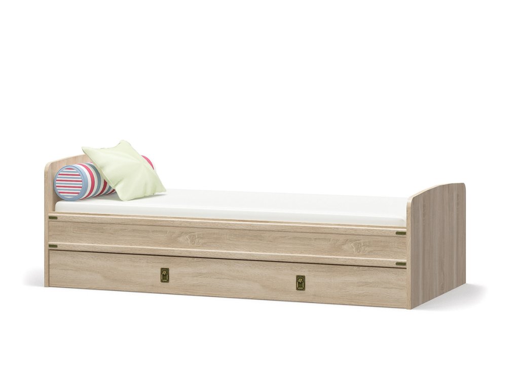 Postel IZABELA je v designovém a atraktivním provedení. Je vhodná do moderních dětských pokojů. Zaujme i náročnější zákazníky. Dětská postel je vyrobena z kvalitních LTD desek, které se snadno udržují. Je v barevném provedení: dub sonoma. Postel IZABELA je jednolůžkový. Ve spodní části se nachází zásuvka pro uložení peřin a podobně. Součástí postele není rošt a matrace. Je třeba si je dokoupit o velikosti 90 x 200 cm. Rozměry (š,v,h): 207 x 68,5 x 97,5 cm. Další prvky IZABELA jsou v naší nabídce. Dodáváme v demontovaném stavu.Doplňkové parametry