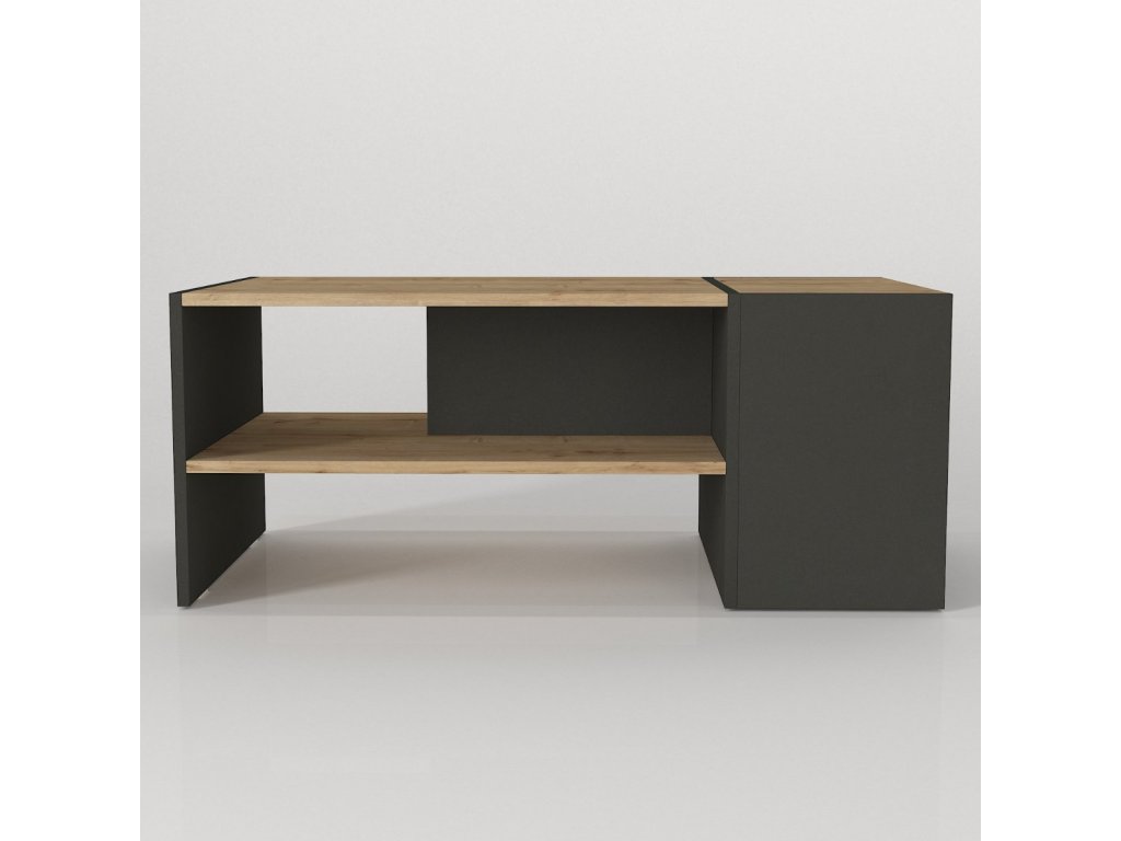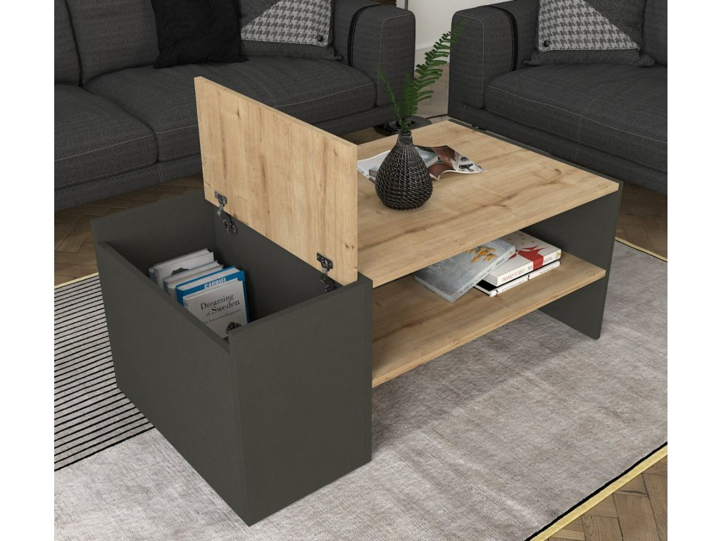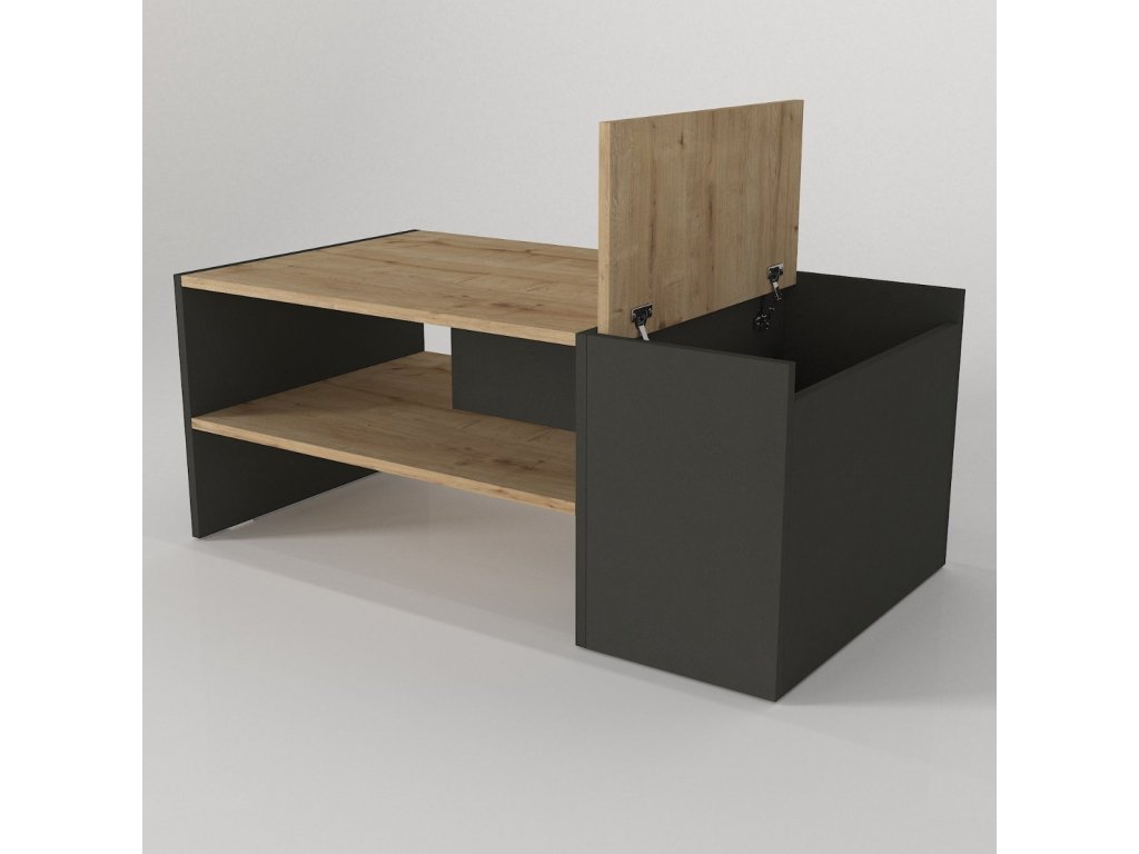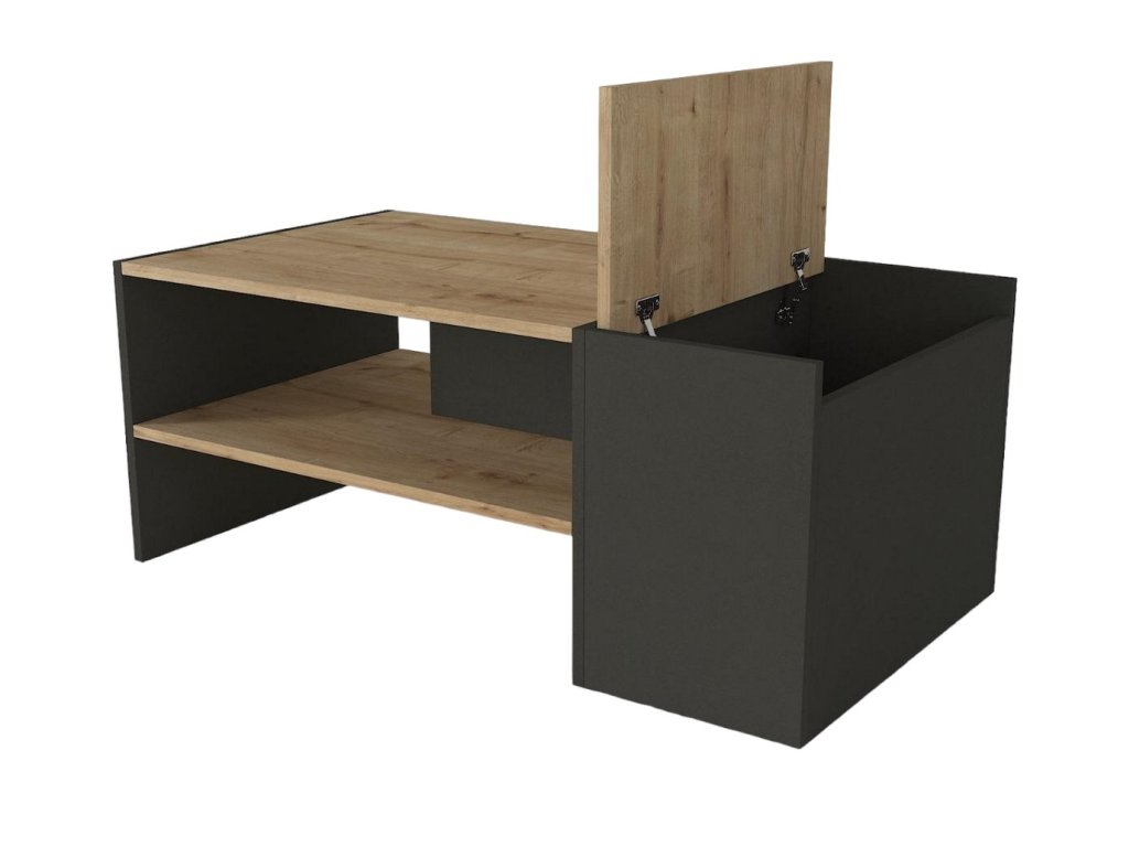 Designový konferenční stolek IZMAEL oživí nejednu obývací pokoj. Jednoduché tvary působí minimalisticky a zároveň moderně i díky černému kontrastu. Stolek nabízí dostatek odkládacího prostoru pro uložení časopisů, knih nebo jiných předmětů, které chcete mít po ruce a to ve formě odkládací police nebo praktického úložného prostoru skrytého pod vrchní výklopnou deskou.
