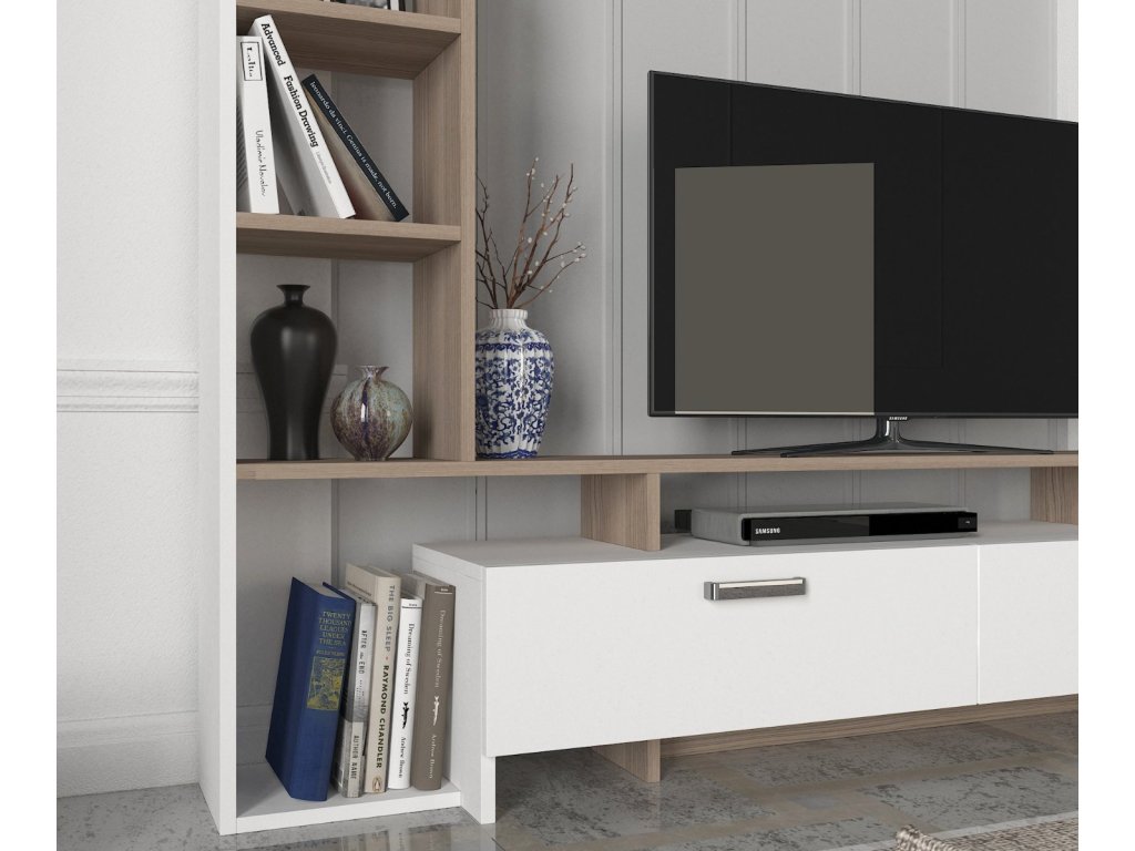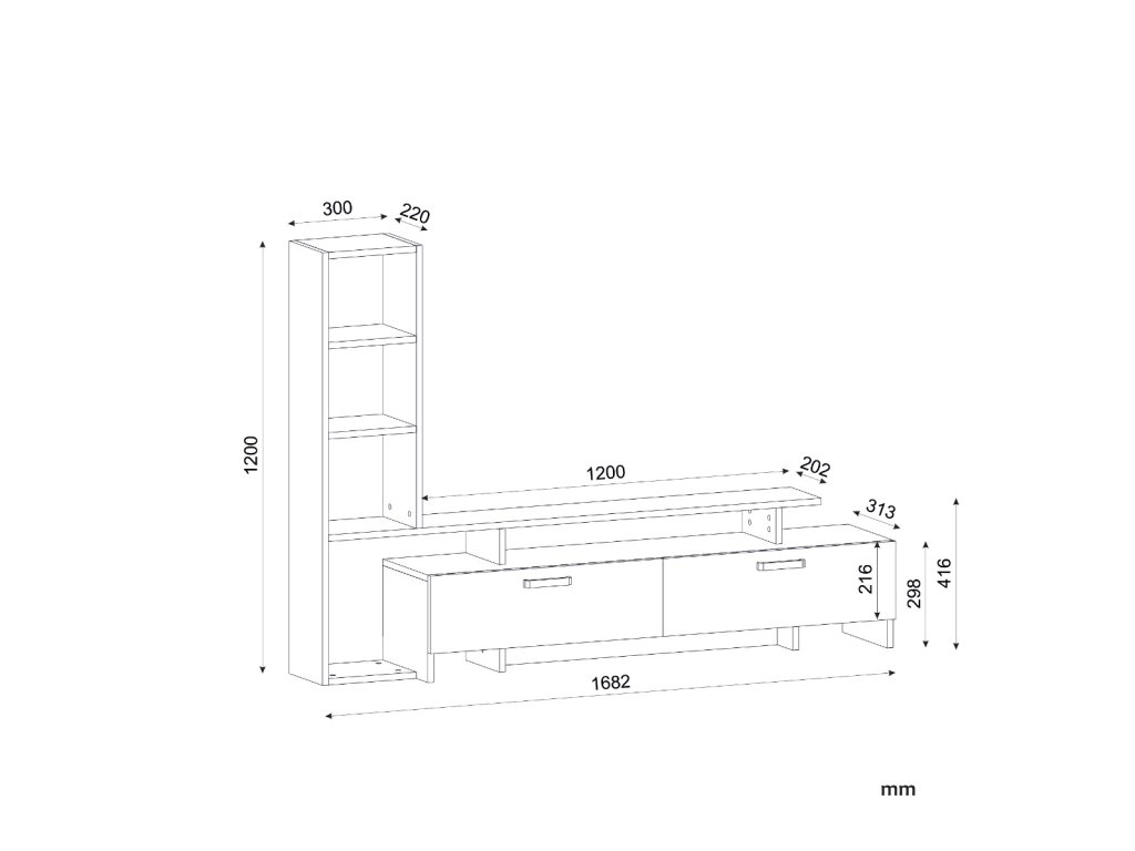 Jednoduchá a malá obývací stěna JAMAL je v moderním provedení a zajímavém tvaru. Díky svým rozměrům se skvěle hodí do malých interiérů. TV stěna obsahuje praktický regál, který poskytuje dostatek úložného prostoru pro odložení knih a dekorací. Stejně dobře poslouží i spodní výklopná skříňka.