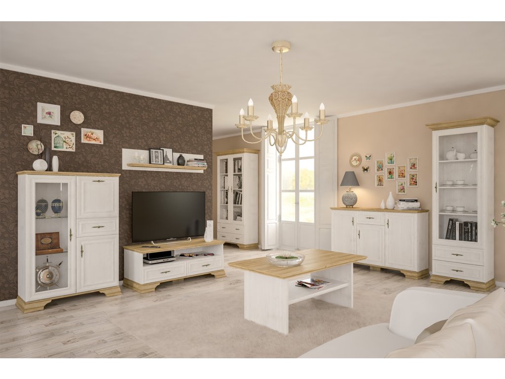 JARMANKA je sektorový prvek s rustikálním nádechem. Jeho stylové provedení je podbarveno kombinací kontrasních barev borovice anderson a dub zlatý. Světlé barvy rozjasní prostor a opticky jej zvětší. Efektní úchyty s ornamentem ve zlatém barevném provedení, dodávají nábytku šmrnc a eleganci. Elegantní oblé hrany naleznete jak na stylovém provedení nožiček tak i na dvířkách a horní zakončovací liště.