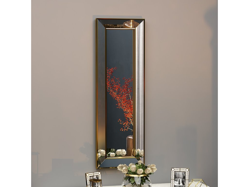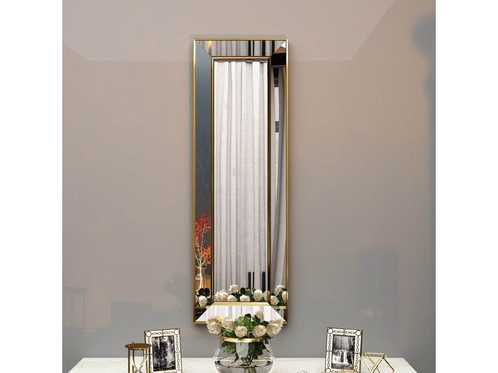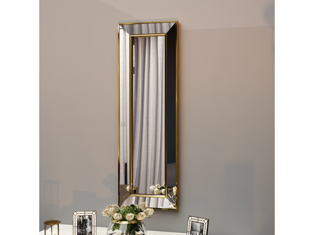 Kvalitní materiály, jako je sklo a MDF, zajišťují dlouhou životnost a snadnou údržbu. Zlatý povrch rámu přidává zrcadlu sofistikovanost a snadno jej začleníte do interiéru s moderním či klasickým laděním.