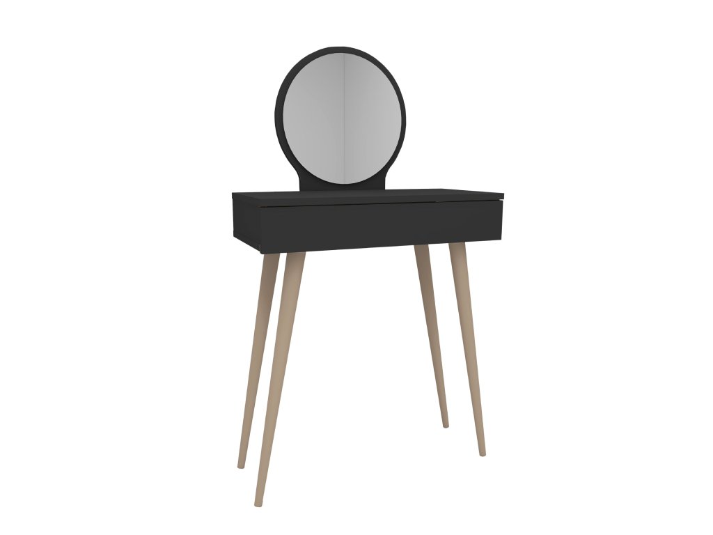 Toaletní stolek JERSEY spojuje moderní design s praktičností, což z něj činí ideální volbu pro každou ložnici. Tento vysoký stolek je vybaven zásuvkou a integrovaným zrcadlem, které usnadní každodenní péči a organizaci kosmetiky. Díky kvalitním materiálům a dřevěným nohám je nejen funkční, ale také stylový.