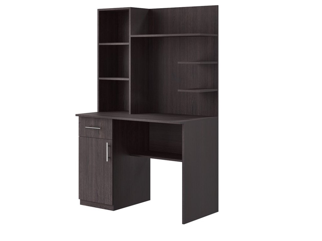 V horní nástavbě je regál a tři odkládací police. Ve spodní části je skříňka se zásuvkou, pod psací plochou je další odkládací police.
