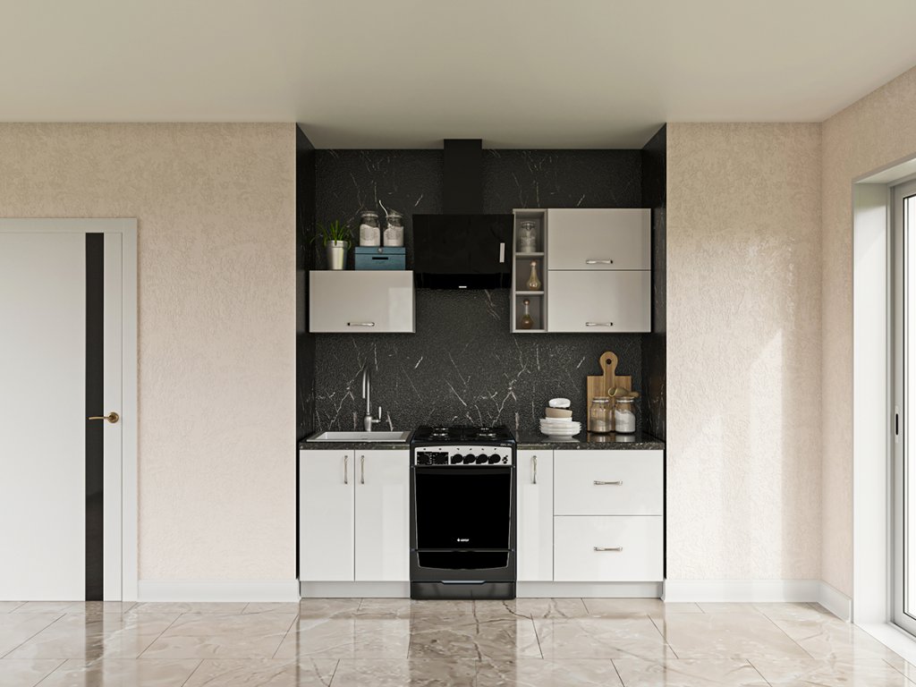 Kuchyňská linka má dvířka v barvě: bílý lesk; korpus je v barvě: bílá matná.