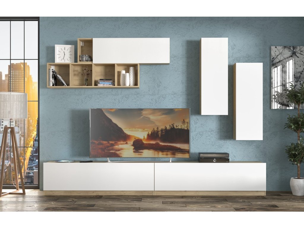 | Sestava obsahuje: | 2x TV stolek (Š x V x H): 140 x 41 x 35 cm, 2x závěsná skříňka (Š x V x H): 35 x 100 x 19,7 cm, závěsný regál (Š x V x H): 120 x 32 x 18 cm, závěsná police (Š x V x H): 120 x 33 x 19,7 cm |