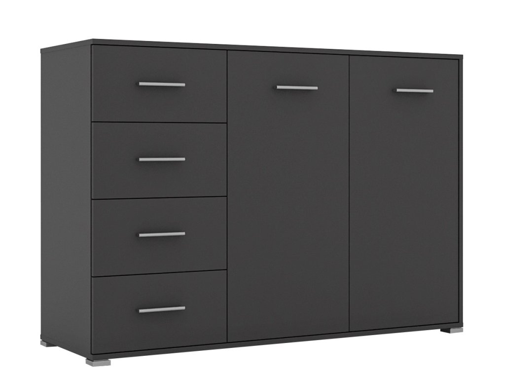 Kombinovaná komoda KAMONE 2D4S je funkční a moderní nábytek vhodný do každého interiéru. Je vyrobena z LTD laminovaného materiálu. Barva grafit šedý dodává komodě příjemný a elegantní vzhled. Komoda disponuje dvěmi dvířky, za kterými se nacházejí dvě police, a čtyřmi zásuvkami.
