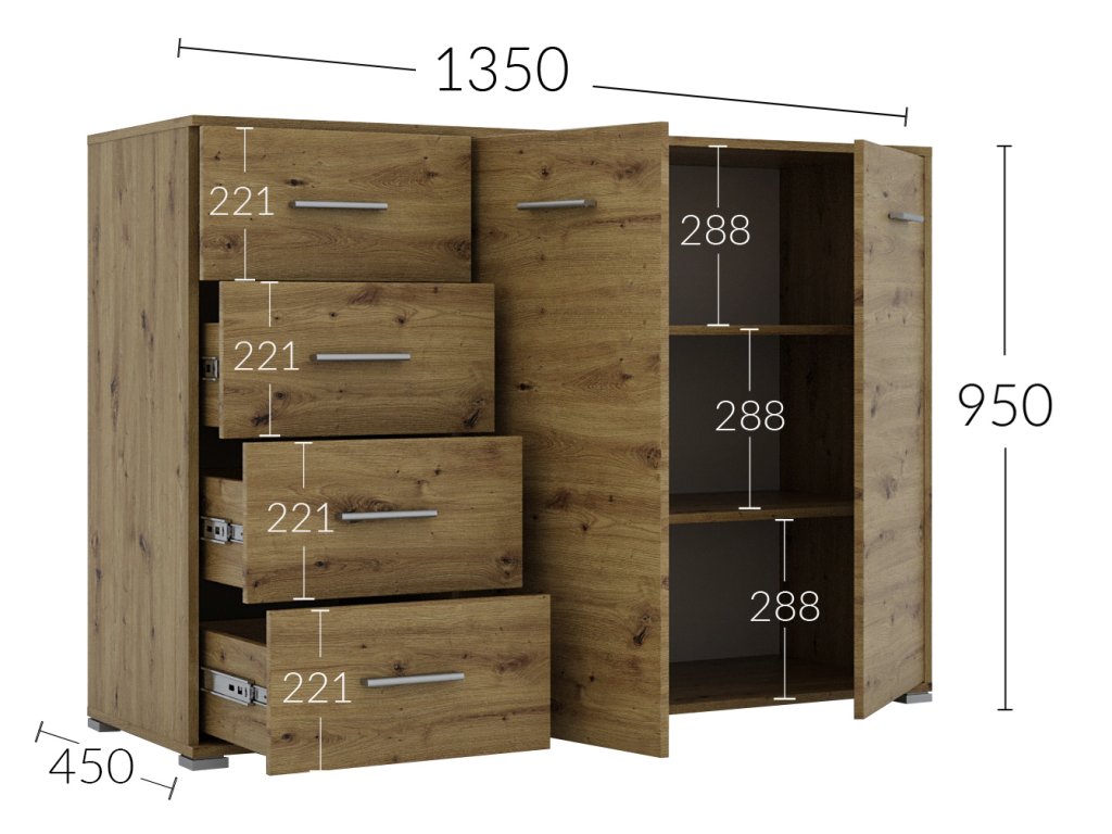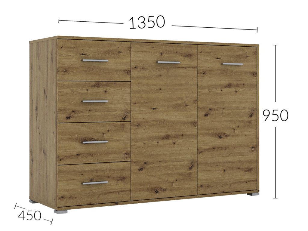 Rozměry komody: Š135 / V95 / H45 cm. Podrobné rozměry v nákresu.