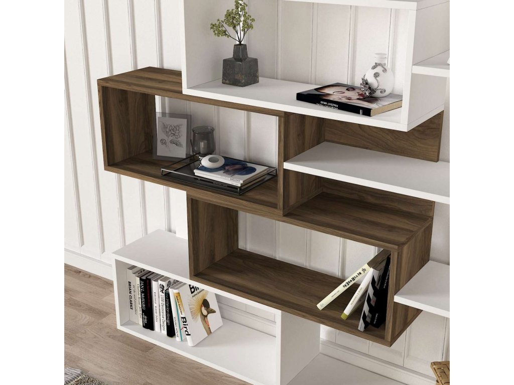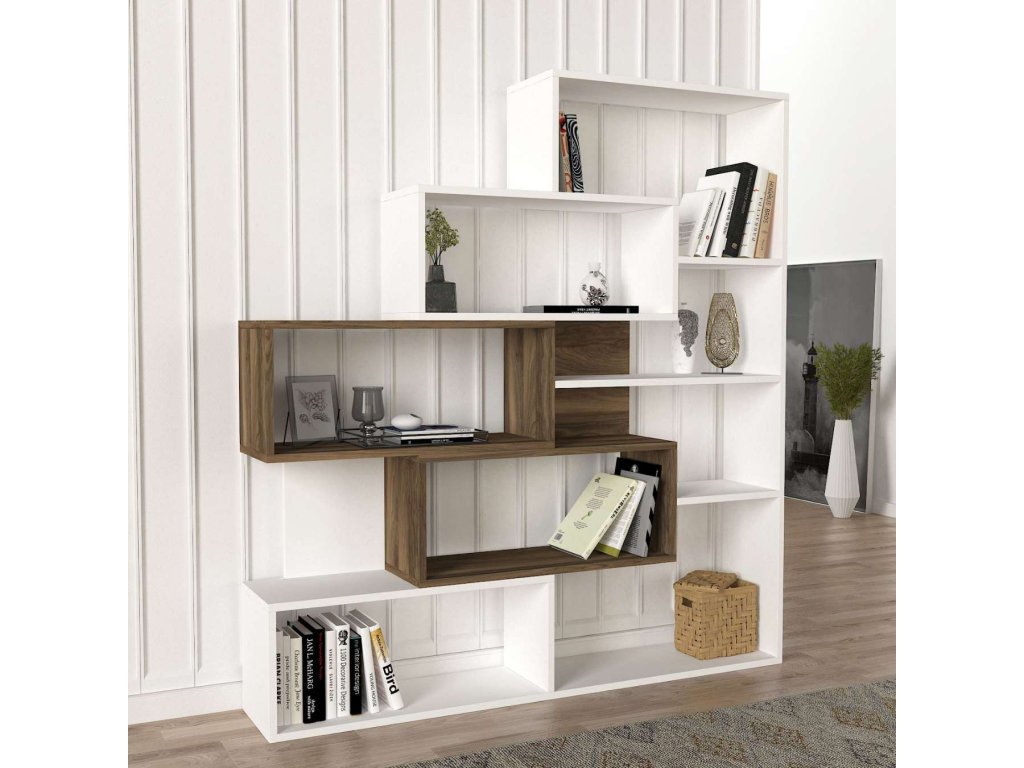 Regál KARLA se pyšní svým moderním designem a kombinací bílé a ořechové barvy, která přináší do interiéru eleganci a styl. Čtyři pevné police poskytují dostatek úložného prostoru pro vaše knihy, dekorace či kancelářské potřeby. Robustní LTD materiál o tloušťce 18 mm zajišťuje dlouhou životnost a stabilitu tohoto regálu.
