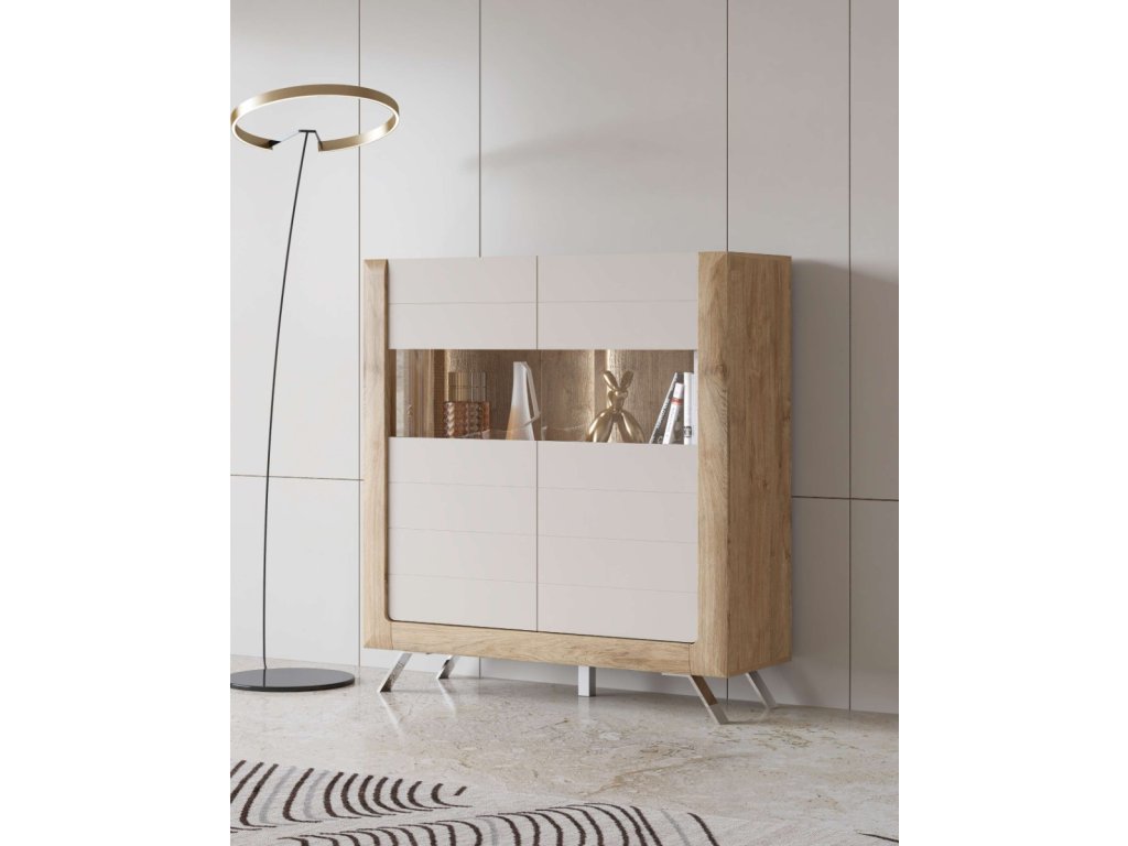 Přidejte do svého interiéru eleganci s naší vysokou komodou KASAJ, vyrobenou z kvalitního LTD o síle 16 mm. Hrany jsou zakončeny ABS lištou 0,6 mm, což zajišťuje dlouhou životnost a odolnost. Moderní barevné provedení zlatý dub a kašmír mat dodává komodě sofistikovaný vzhled.