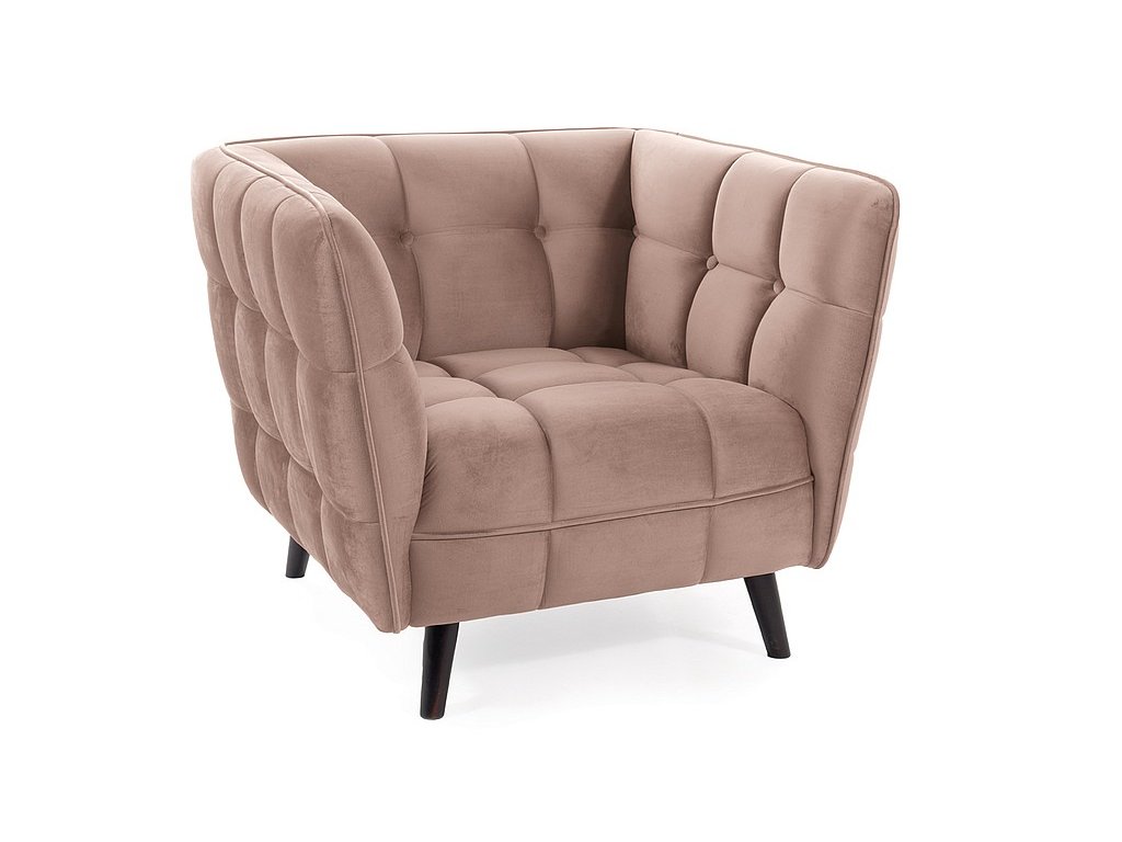 Čalounění je látkové sametové, s ozdobným čtvercovým prošíváním. Křeslo stojí na šikmých dřevěných nožičkách v barvě wenge. V tomto designu najdete v naší nabídce také stylovou pohovku.