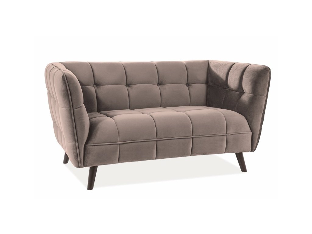 Čalounění je látkové sametové s ozdobným čtvercovým prošíváním. Pohovka stojí na šikmých dřevěných nožičkách v barvě wenge. V tomto designu najdete v naší nabídce také stylové křeslo.