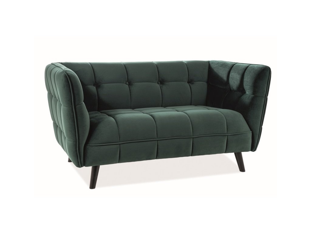 Čalounění je látkové sametové s ozdobným čtvercovým prošíváním. Pohovka stojí na šikmých dřevěných nožičkách v barvě wenge. V tomto designu najdete v naší nabídce také stylové křeslo.