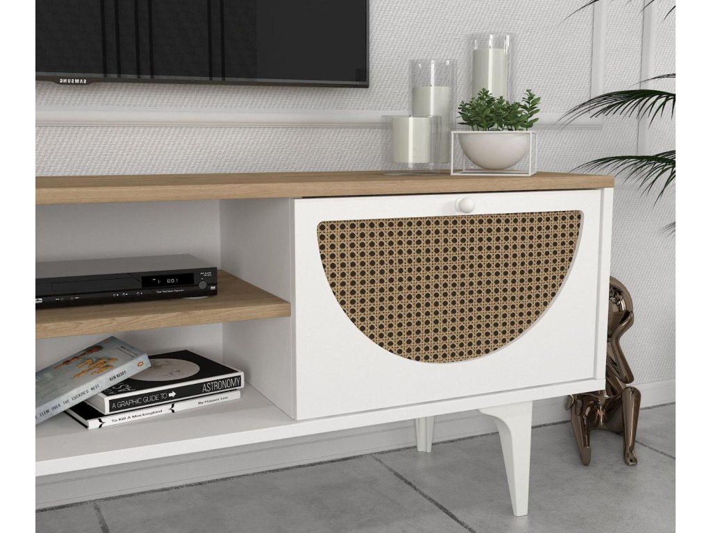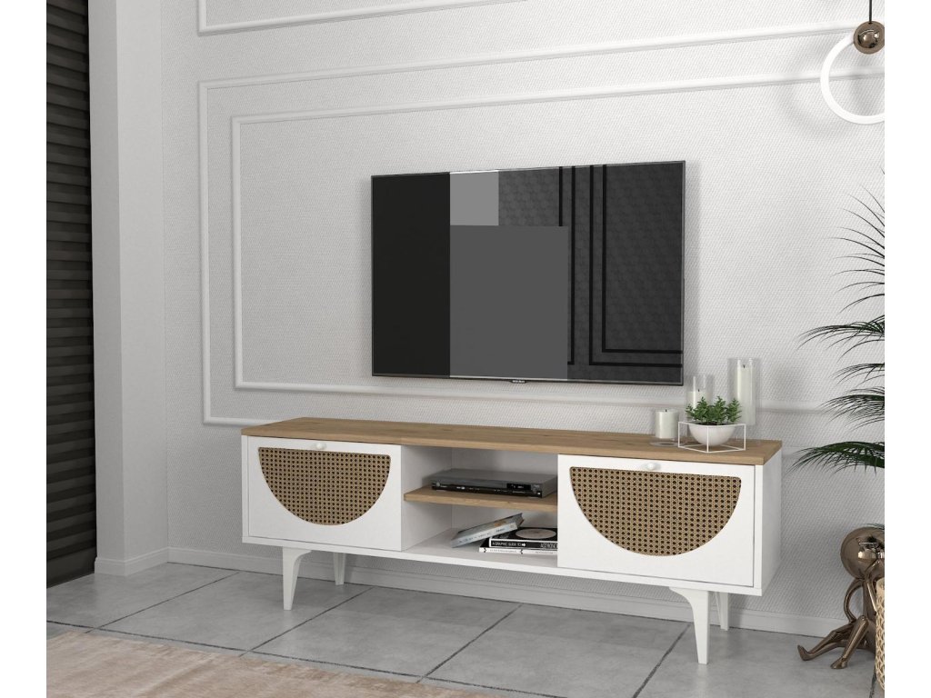 TV stolek KEBAB je skvělou volbou pro každého, kdo hledá funkční a estetické řešení pro svůj obývací pokoj. Vyrobený z kvalitního LTD materiálu s tloušťkou 18 mm, zajišťuje pevnost a dlouhou životnost. Kombinace bílé a světle hnědé barvy dodává stolku moderní a příjemný vzhled, který se hodí do jakéhokoli interiéru.