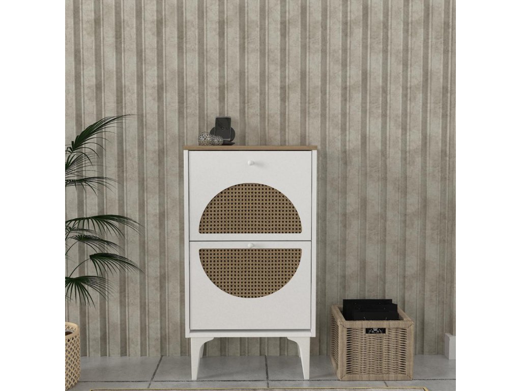 Botník KEBAB je skvělou volbou pro každého, kdo hledá praktické a estetické řešení pro svůj obývací pokoj. Vyrobený z kvalitního LTD materiálu s tloušťkou 18 mm, zajišťuje pevnost a dlouhou životnost. Kombinace bílé a světle hnědé barvy dodává botníku moderní a svěží vzhled, který se hodí do jakéhokoli interiéru.