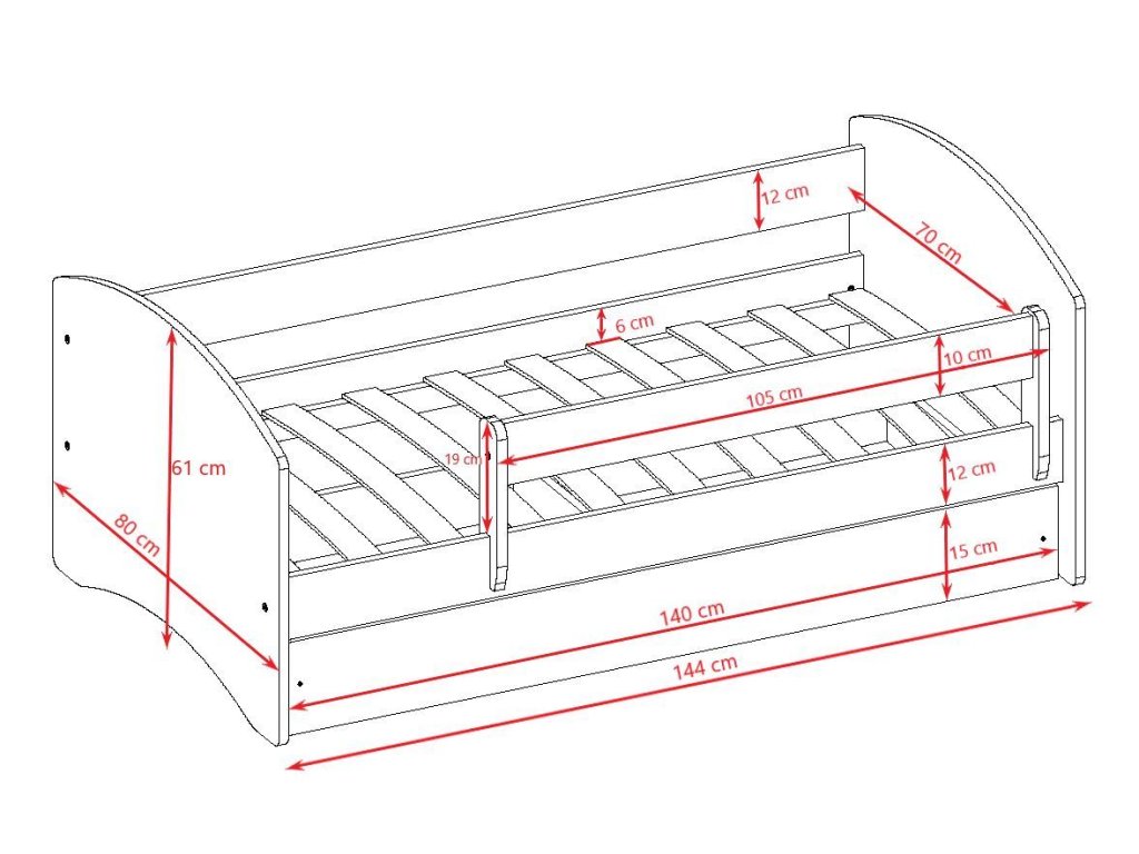 Jednolůžko se zábradlím je vyrobeno z kvalitní nábytkové desky o tloušťce 18 mm.