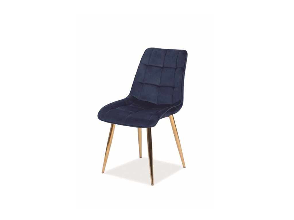 KIK je moderní židle, vhodná do jídelny i kuchyně. Své místo si však najde také v restauraci či kafeterii. Design židle zvýrazňuje její sametové provedení a efektní prošití čalouněných částí. Pro pohodlné sezení má židle čalouněný sedák i opěrku. Konstrukce židle je kovová, ve zlaté barvě. Sedací a opěrková část je čalouněna kvalitní sametovou látkou BLUVEL 86 v modrém barevném odstínu. Rozměry židle: Celková výška židle: 89 cm Výška sedáku: 49 cm Hloubka: 44 cm Šířka: 51 cm Dodáváno v demontu. Židle je dostupná iv dalších barvách.Doplňkové parametry