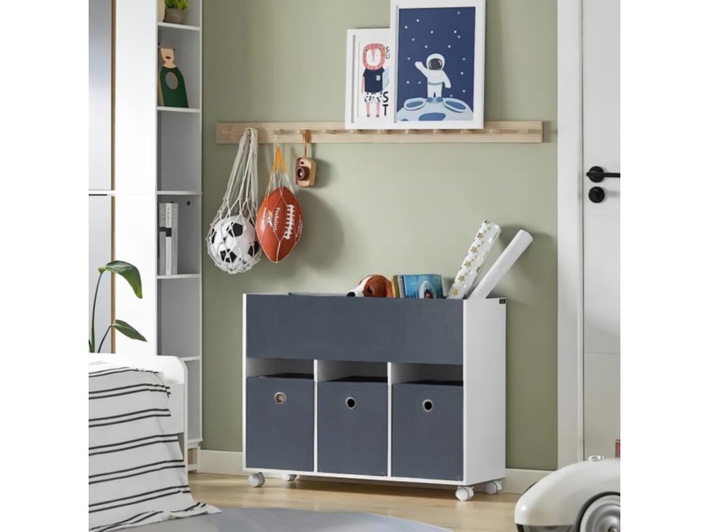 Dětský regál na kolečkách KINDER bude Vaším praktickým pomocníkem, který udrží pokoj Vaší ratolesti vždy uklizený a přehledný. Regál má k dispozici 3 pevné horní přihrádky a 3 látkové boxy, čímž poskytuje dostatek úložného prostoru. Praktická kolečka pomáhají snadný přesun regálu tam, kde jej právě potřebujete.