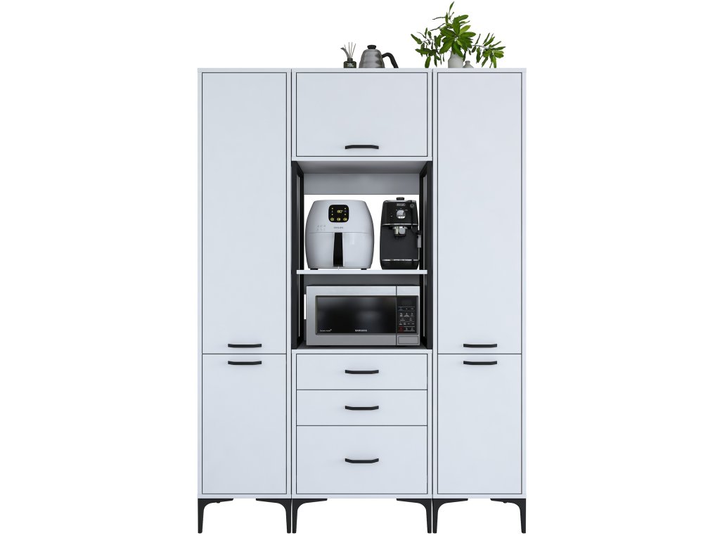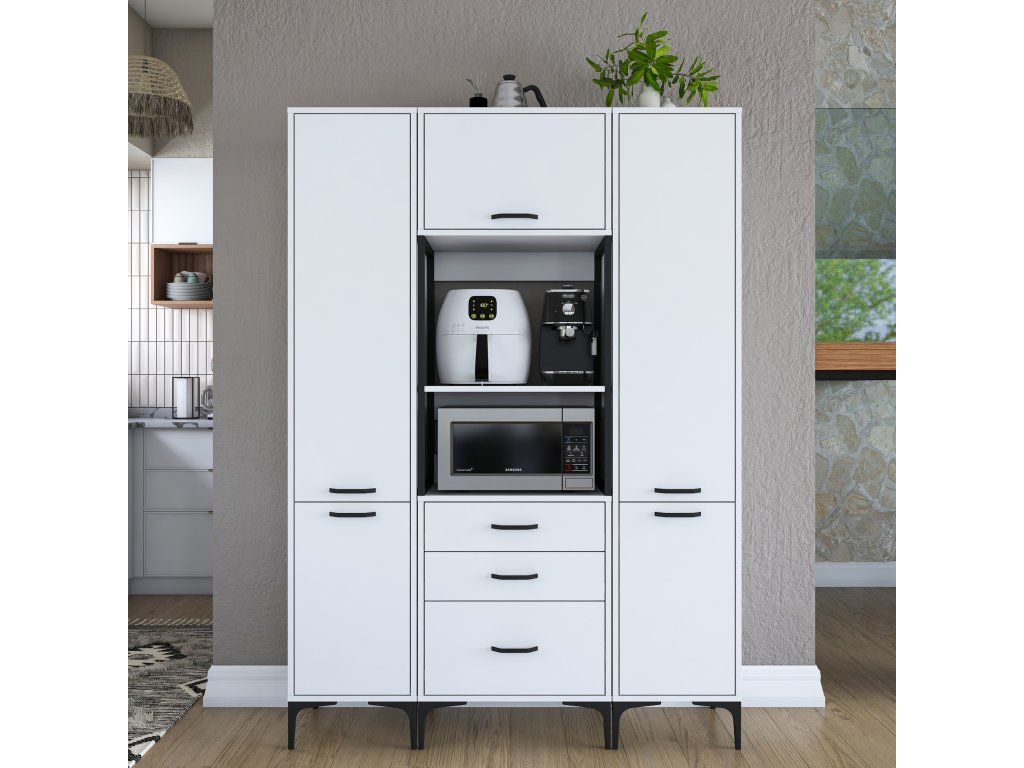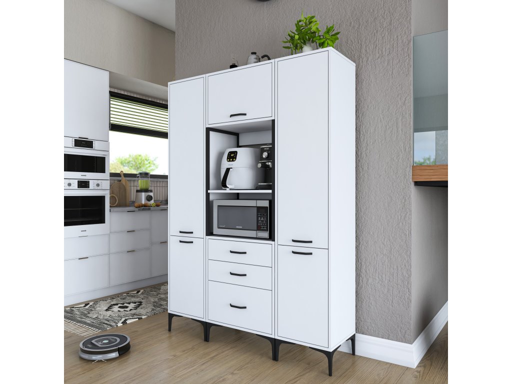 Skříň KITTY je navržena tak, aby poskytovala dostatek úložného prostoru pro vaše kuchyňské potřeby. Obsahuje pět plných dvířek, tři zásuvky a praktický regálek, který je ideální pro umístění mikrovlnné trouby nebo jiných kuchyňských spotřebičů.