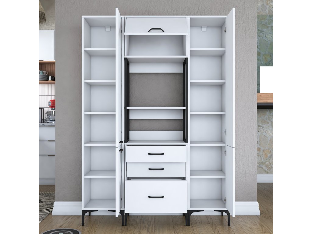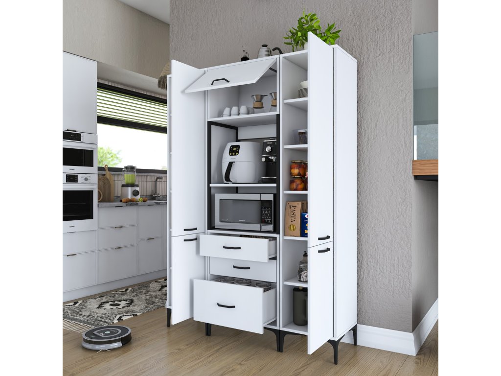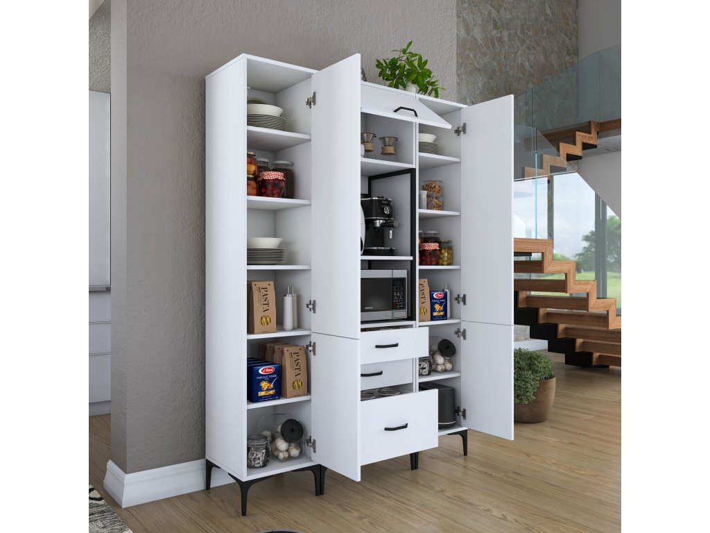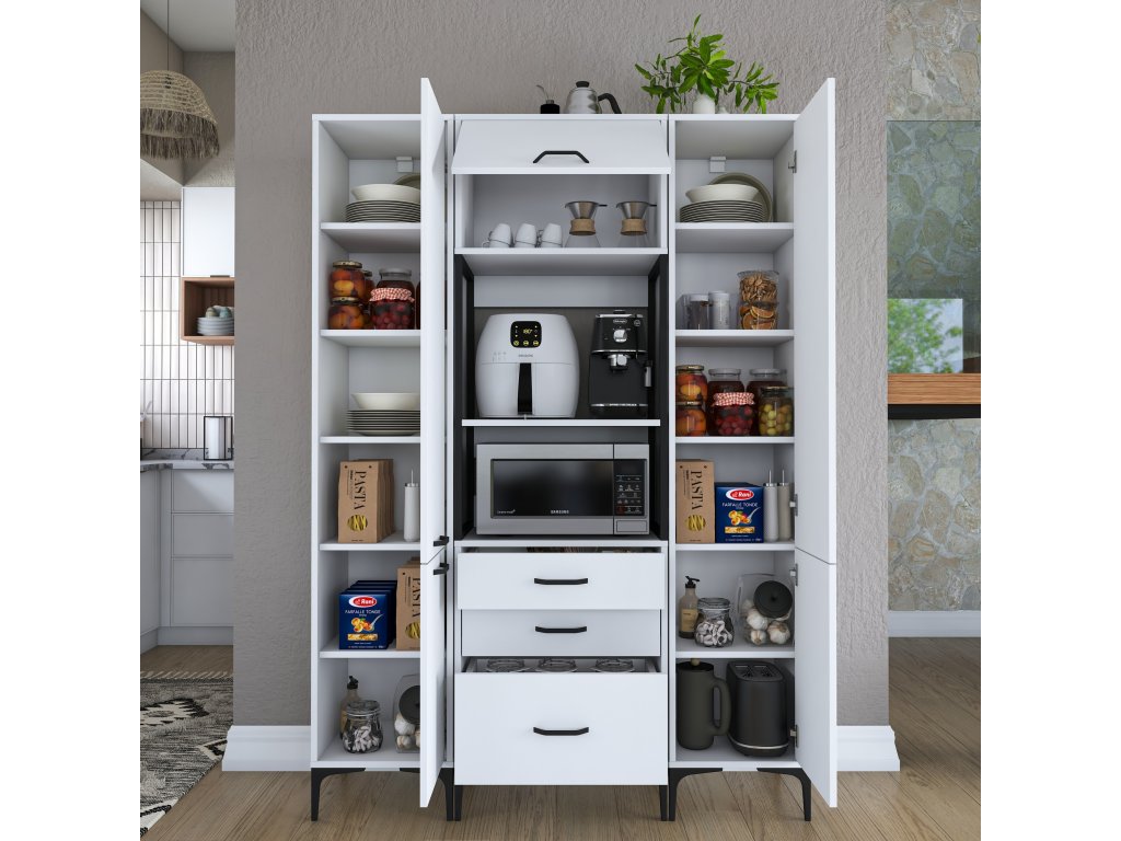 Policová skříň KITTY kombinuje funkčnost a moderní skandinávský styl, který přinese do vaší kuchyně čistý a elegantní vzhled. S bílým provedením a promyšleným designem poskytuje praktické úložné řešení pro každý domov.