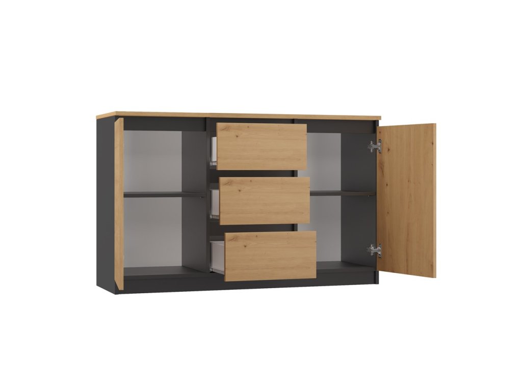 Tato komoda nabízí dvoje plné dvířka a tři praktické zásuvky, což umožňuje snadnou organizaci a přístup k vašim věcem. Její variabilní design a úložný prostor ji činí ideální volbou pro ukládání oblečení, dokumentů, knih nebo dekoračních předmětů.