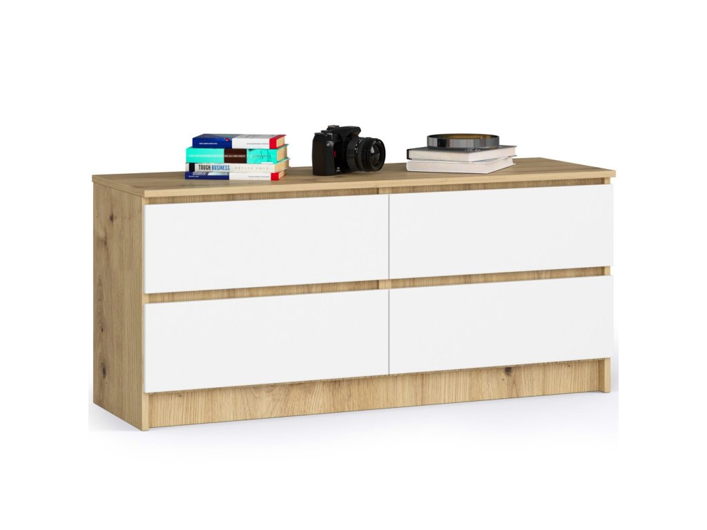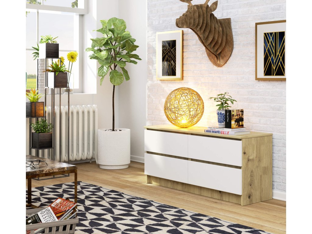 Díky své barevné kombinaci a funkčnímu designu je komoda OTILIE120 ideálním doplňkem pro různé styly bydlení. Její čtyři zásuvky poskytují dostatek místa pro vše potřebné, ať už se jedná o knihy, oblečení nebo jiné předměty.