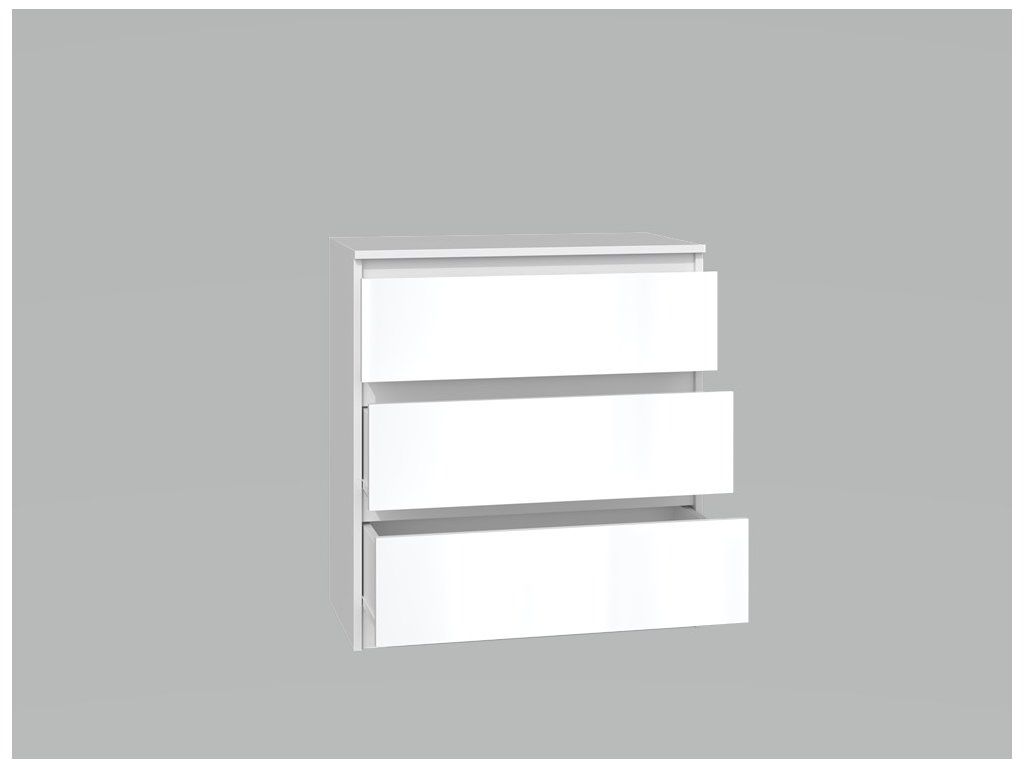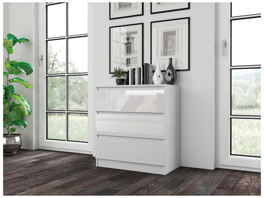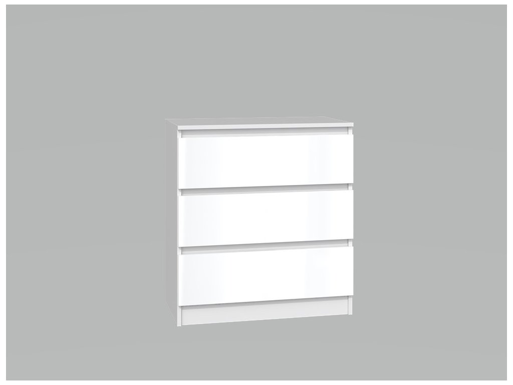 Komoda WALMA M3 v moderním designu je vhodná do každého interiéru, protože v sobě spojuje jednoduchost a eleganci. Určitě oceníte také tři praktické zásuvky, kde si můžete uložit dokumenty, oblečení nebo jiné potřebné věci. Komoda je vyrobena z kvalitní LTD desky, která je nenáročná na údržbu a odolná vůči poškrábání. Hrany jsou chráněny ABS páskou. Komoda má bezúchytový systém otevírání, takže Vám v prostoru nebudou zavazit žádné úchyty a zároveň to posílí její moderní design. Rozměry (ŠxVxH) : 70 x 77 x 40 cm >Barevné provedení : bílý lesk