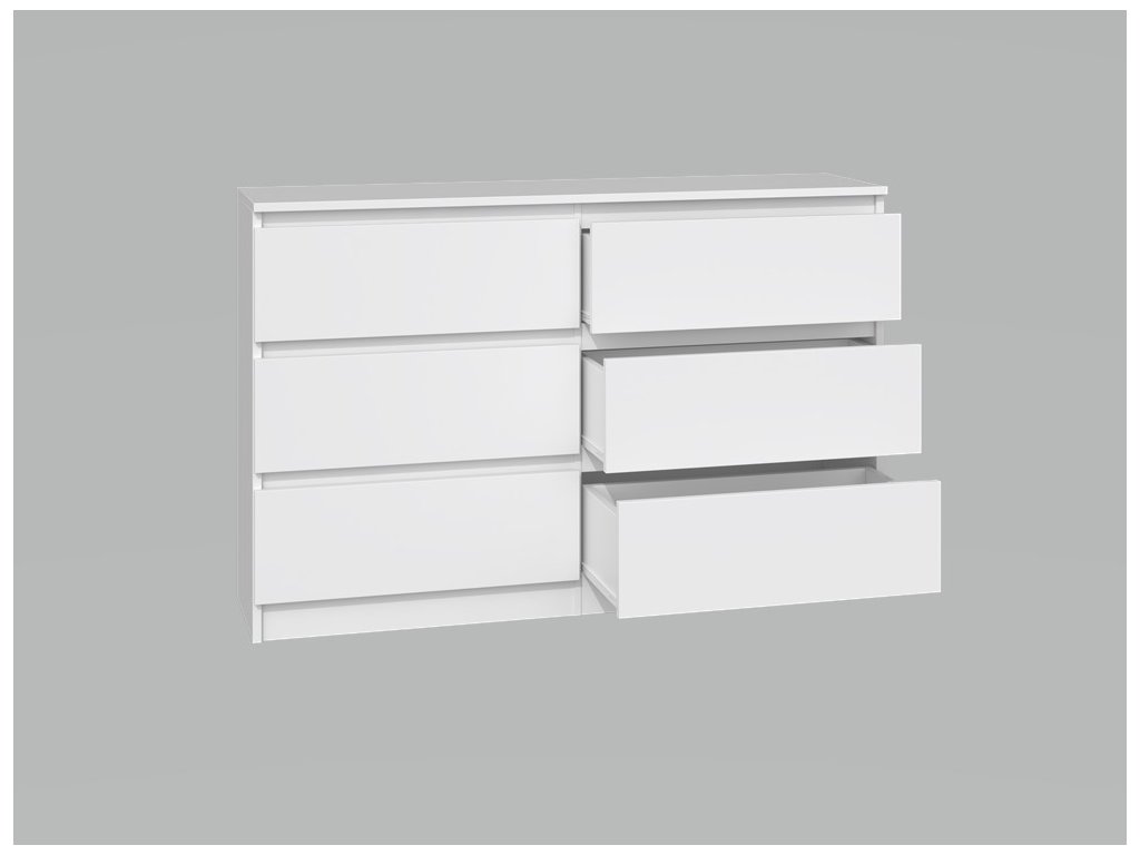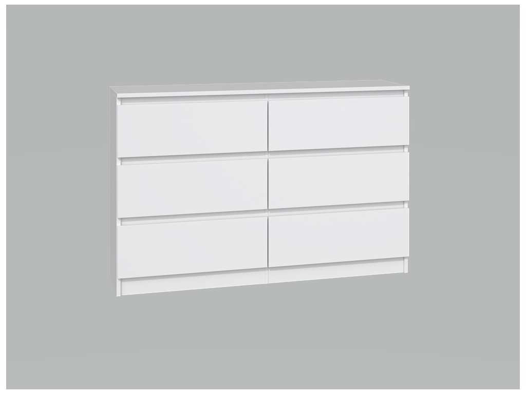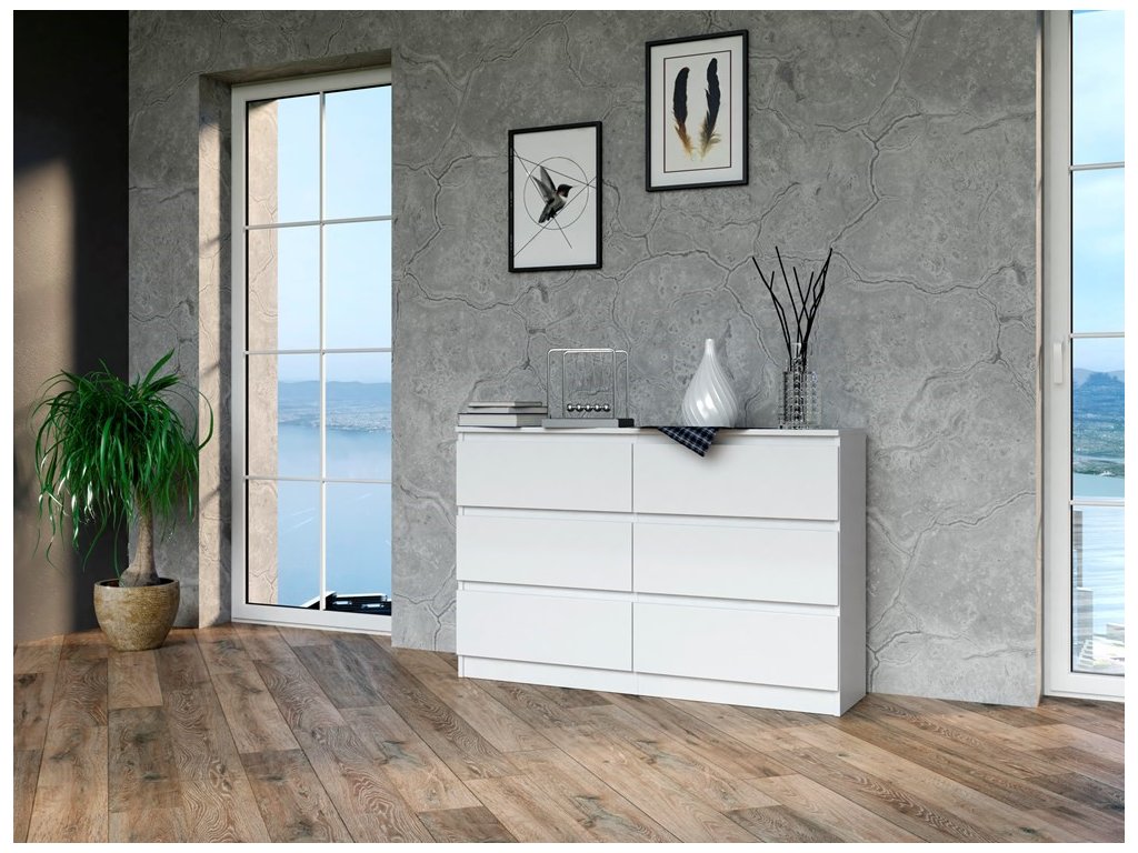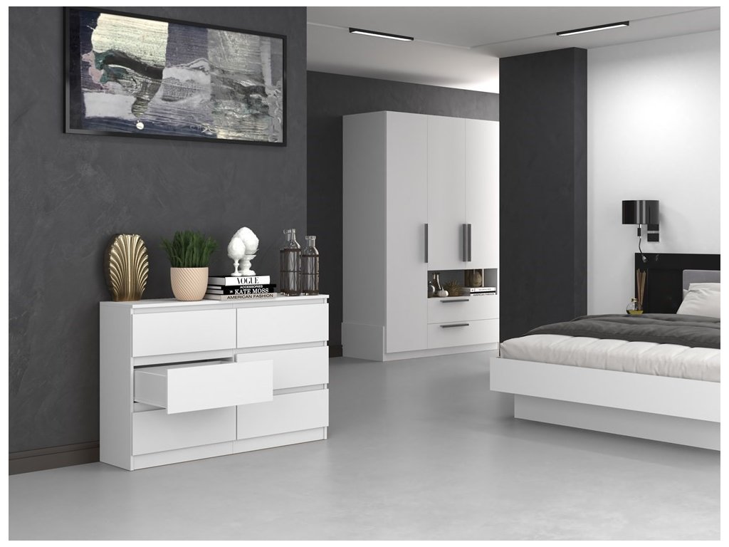 Komoda WALMA M6 120 v moderním designu je vhodná do každého interiéru, protože v sobě spojuje jednoduchost a eleganci. Určitě oceníte také šest praktických zásuvek, kde si můžete uložit dokumenty, oblečení nebo jiné potřebné věci. Komoda je vyrobena z kvalitní LTD desky, která je nenáročná na údržbu a odolná vůči poškrábání. Hrany jsou chráněny ABS páskou. Komoda má bezúchytový systém otevírání, takže Vám v prostoru nebudou zavazit žádné úchyty a zároveň to posílí její moderní design. >Barevné provedení : bílá