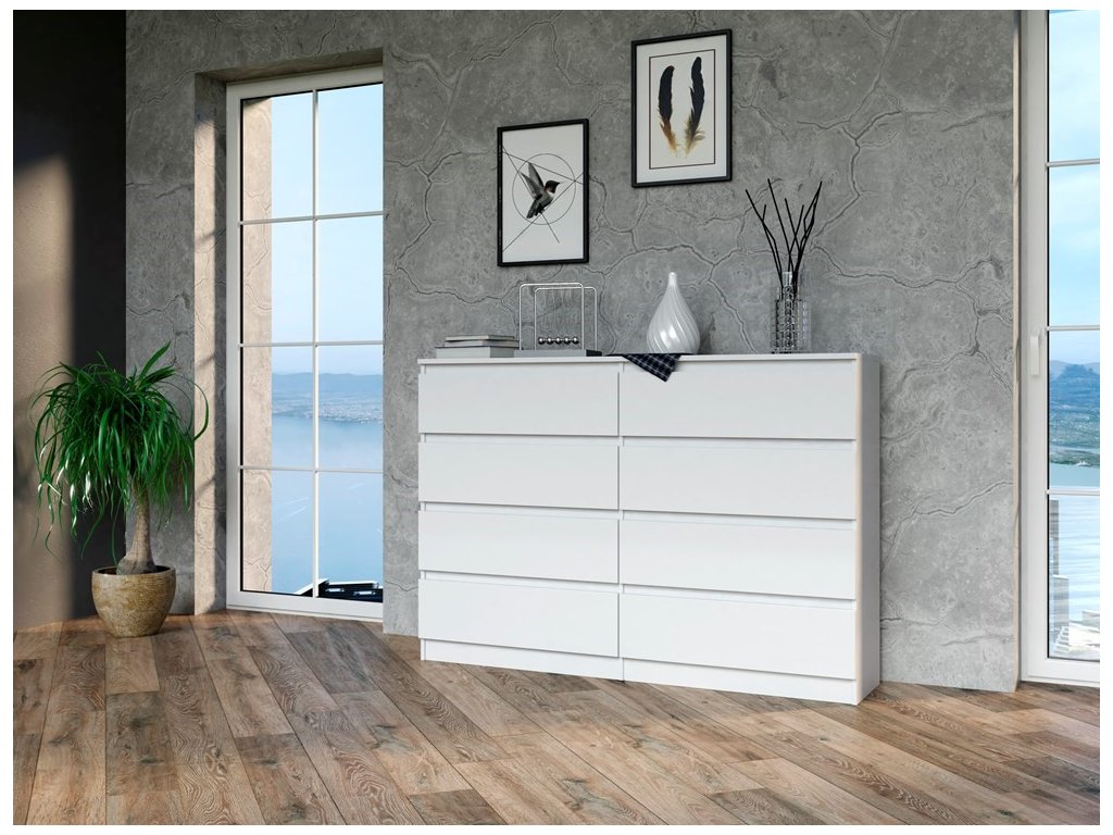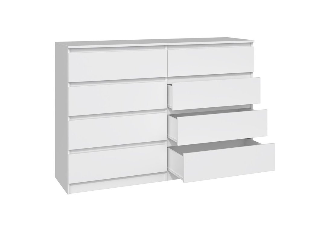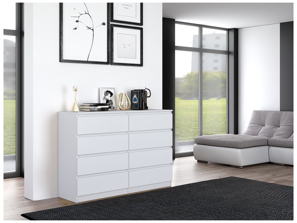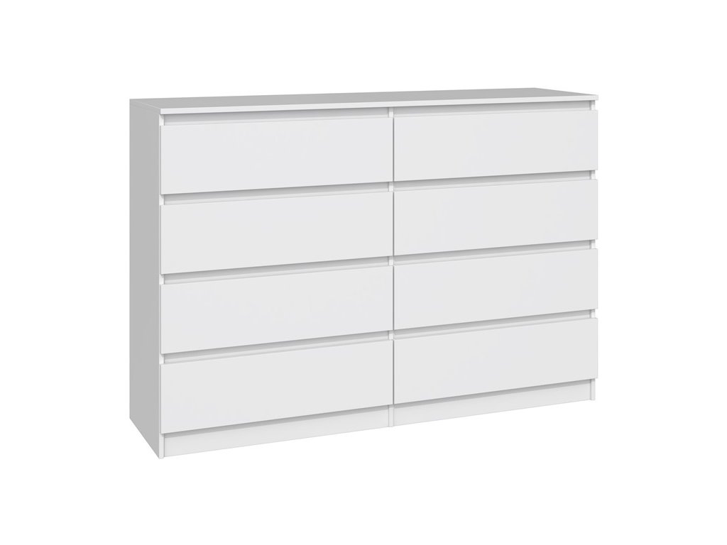 Komoda WALMA M8 140 v moderním designu je vhodná do každého interiéru, neboť v sobě spojuje jednoduchost a eleganci. Určitě oceníte také osm praktických zásuvek, kde si můžete uložit dokumenty, oblečení nebo jiné potřebné věci. Komoda je vyrobena z kvalitní LTD desky, která je nenáročná na údržbu a odolná vůči poškrábání. Hrany jsou chráněny ABS páskou. Komoda má bezúchytový systém otevírání, takže Vám v prostoru nebudou zavazit žádné úchyty a zároveň to posílí její moderní design. />Barevné provedení : bílá