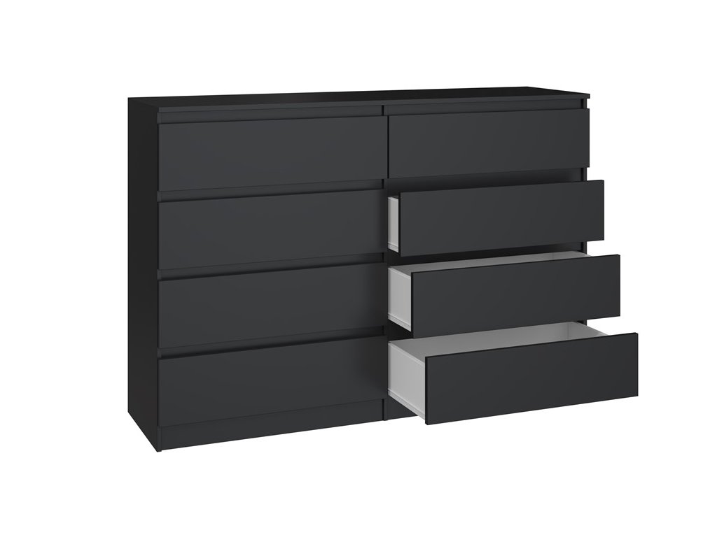 Komoda WALMA M8 140 v moderním designu je vhodná do každého interiéru, neboť v sobě spojuje jednoduchost a eleganci. Určitě oceníte také osm praktických zásuvek, kde si můžete uložit dokumenty, oblečení nebo jiné potřebné věci. Komoda je vyrobena z kvalitní LTD desky, která je nenáročná na údržbu a odolná vůči poškrábání. Hrany jsou chráněny ABS páskou. Komoda má bezúchytový systém otevírání, takže Vám v prostoru nebudou zavazit žádné úchyty a zároveň to posílí její moderní design. />Barevné provedení : černá