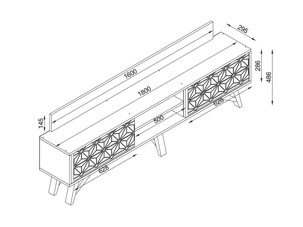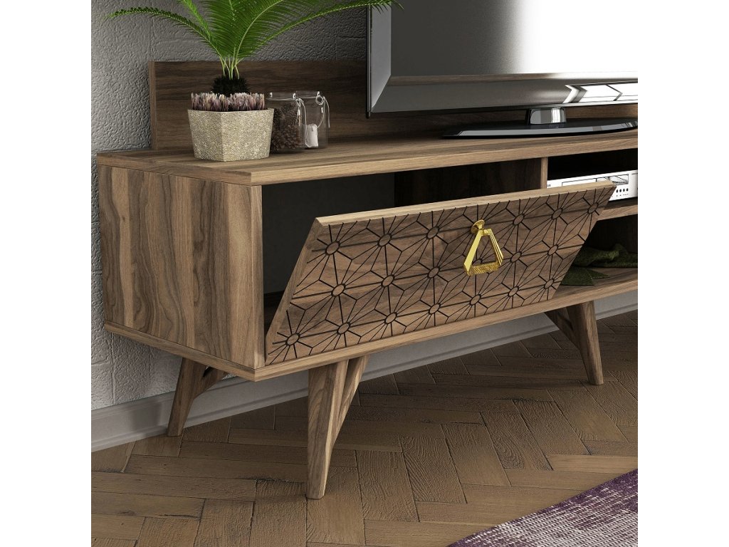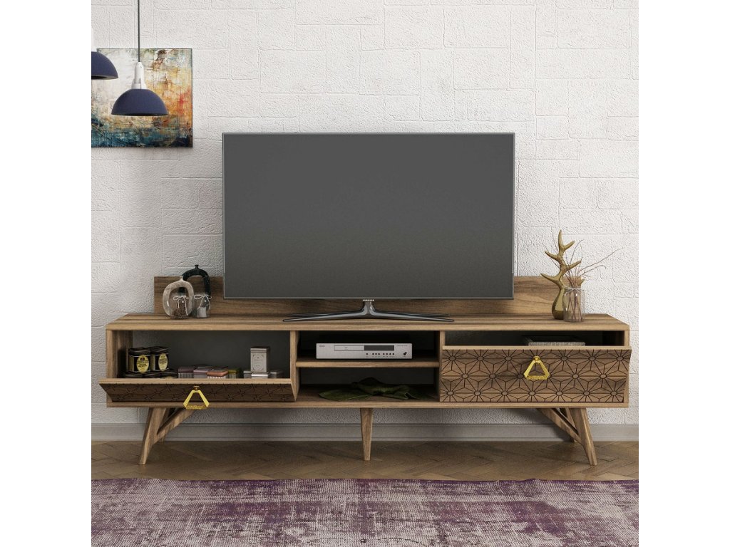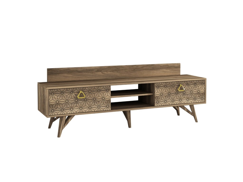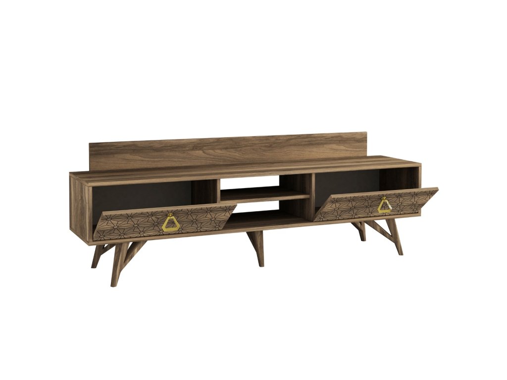 TV skříňka poskytuje dostatek úložného prostoru ve formě skříněk s výklopem. Ve střední části jsou dvě otevřené police pro uložení wifi routeru a podobně.