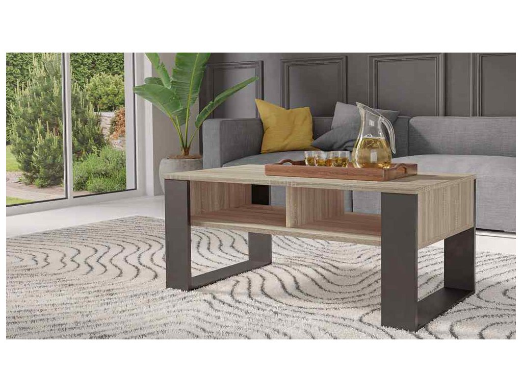 Konferenční stůl MODERN 2P v dub Sonoma a černé barvě je ideálním doplňkem pro váš obývací pokoj. Jeho minimalistický design a praktický regál přinášejí do vašeho interiéru nejen krásu, ale také úložný prostor. Vytvořte si moderní a stylový obývací prostor s konferenčním stolem MODERN 2P.