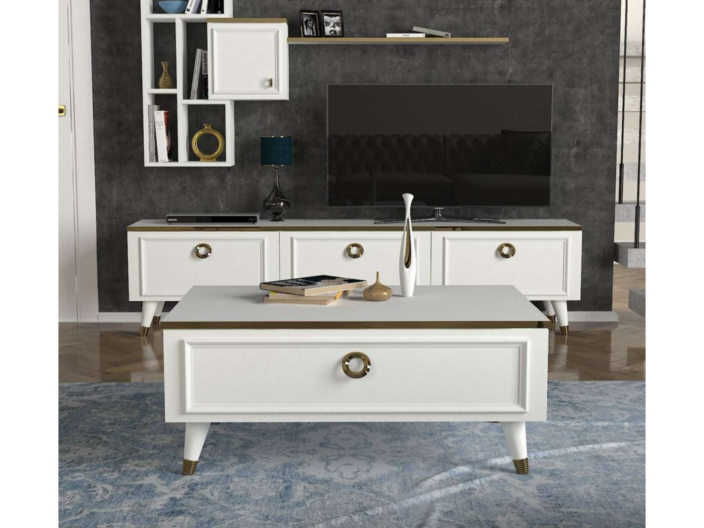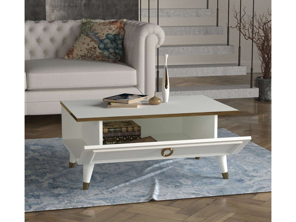 Konferenční stolek KORNELIA je ideální volbou pro ty, kteří hledají moderní a funkční nábytek. Jeho čistě bílá barva a minimalistický design přináší do vašeho domova svěžest a moderní styl, zatímco poskytují dostatek úložného prostoru pro všechny vaše potřeby.